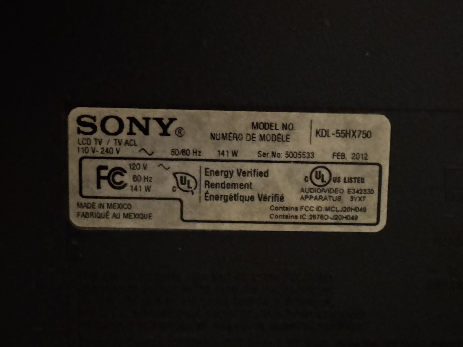 Модель: sony kdl-55hx750