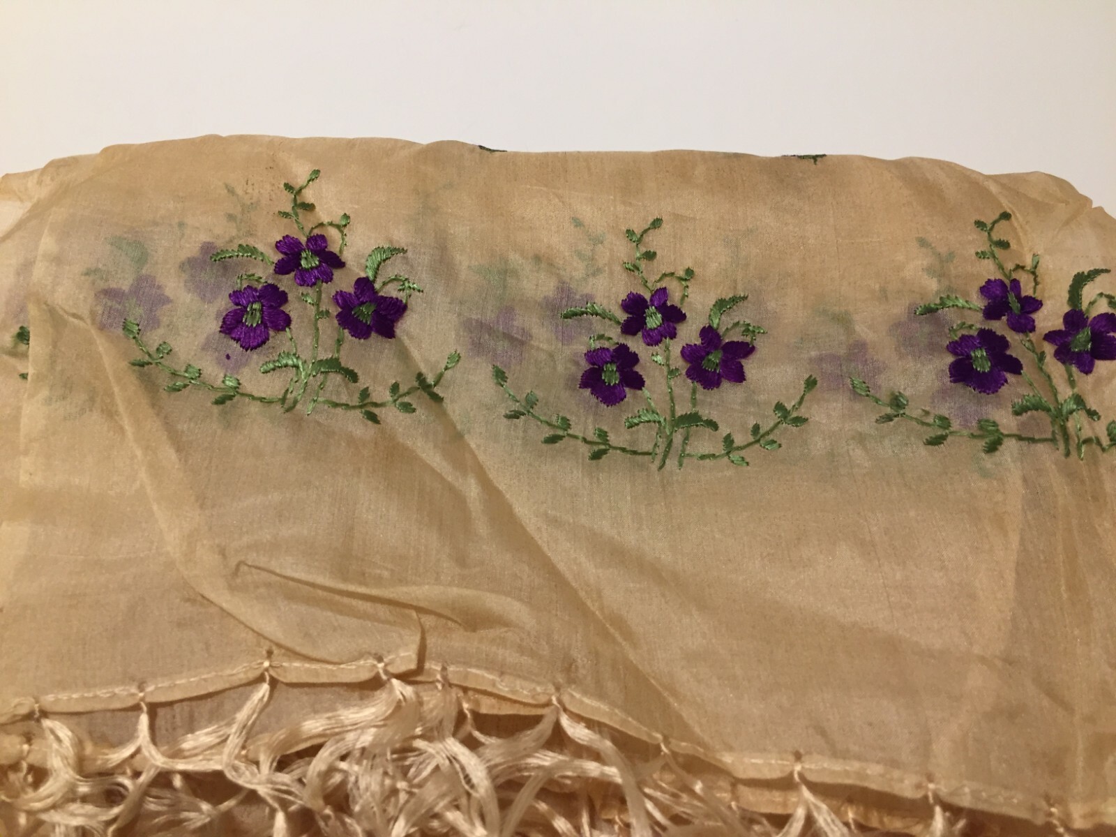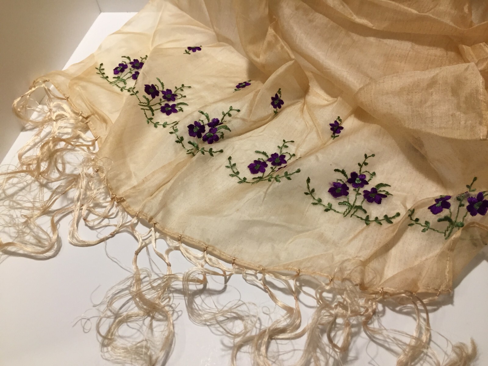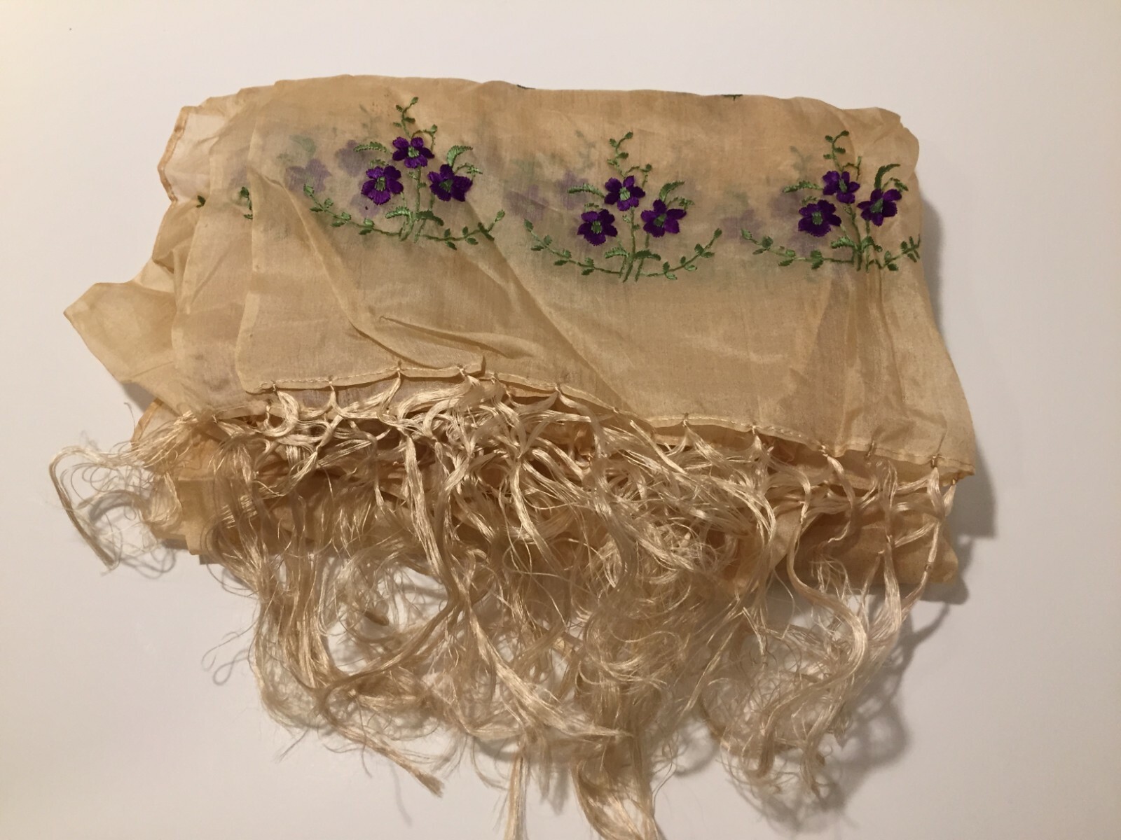 как выглядит Vintage Delicate Women Ladies Scarf Peach/Tan Color w/Purple Embroidered Flowers фото