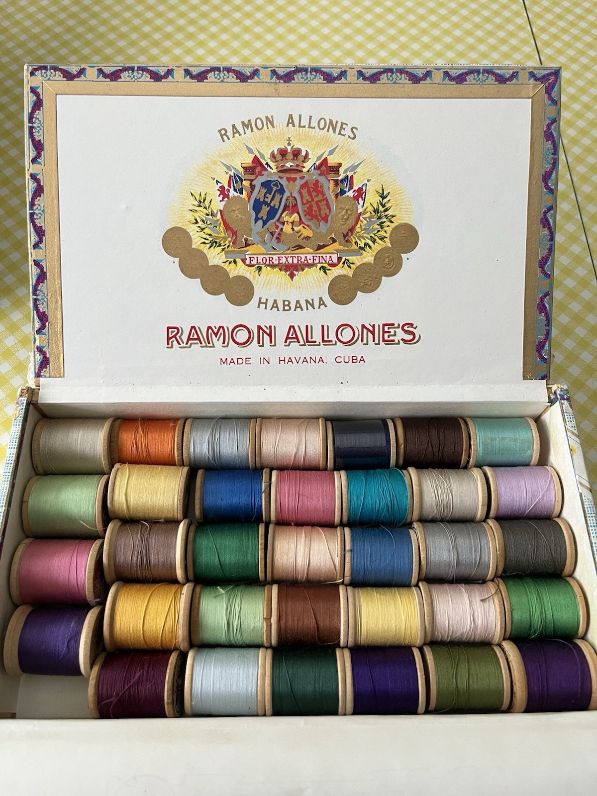 • Vtg Lot 34 Wooden Spools Cotton Sewing Thread Cigar Box Lily Belding Coats Clark