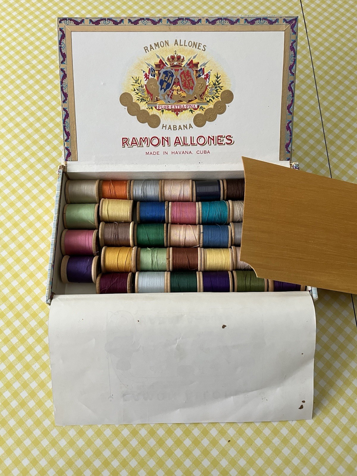 Vtg Lot 34 Wooden Spools Cotton Sewing Thread Cigar Box Lily Belding Coats Clark