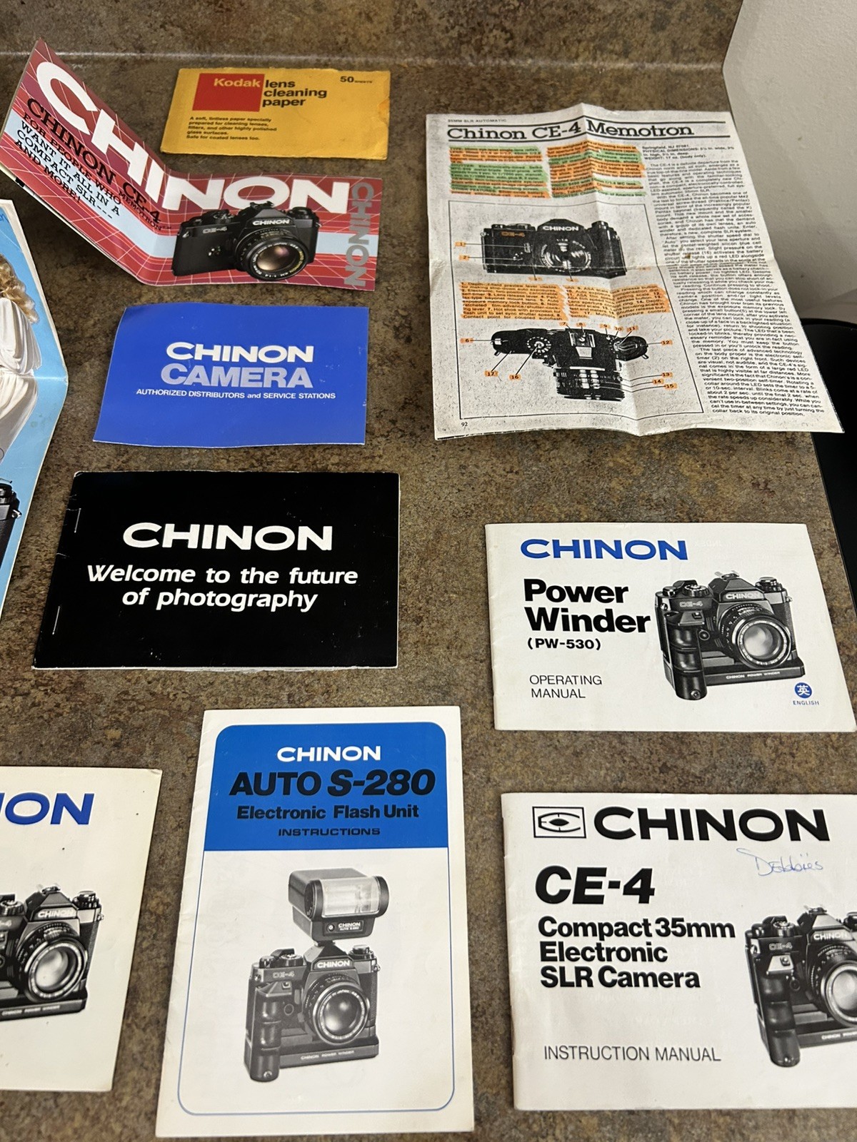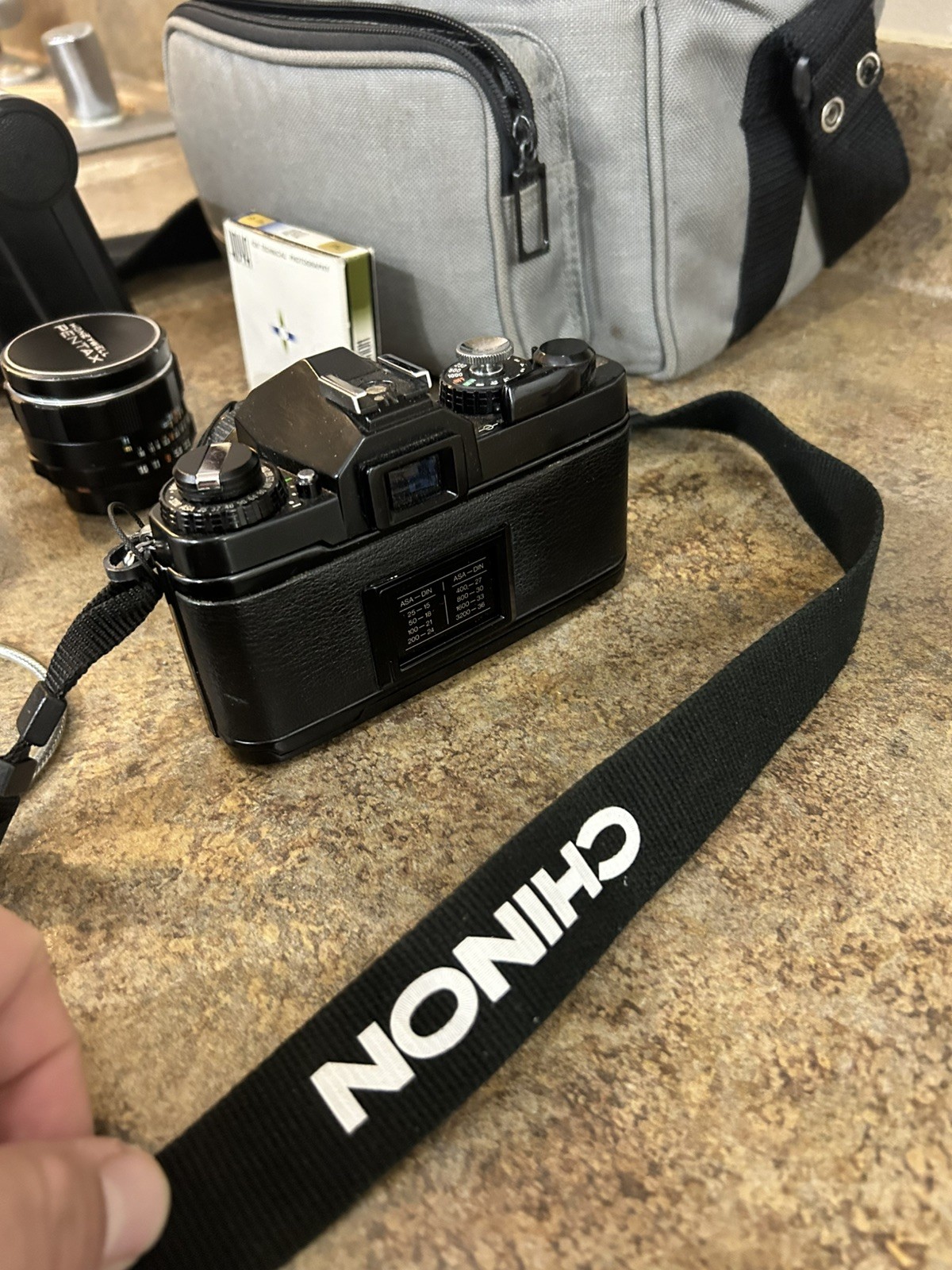 Chinon CE-4 35mm SLR w/ 50mm 28mm, 3 Lenses Filters Strap Bag JAPAN, EXC