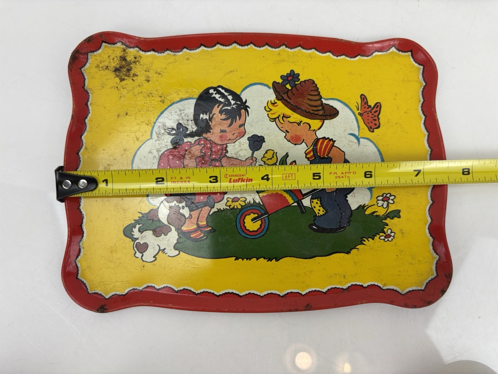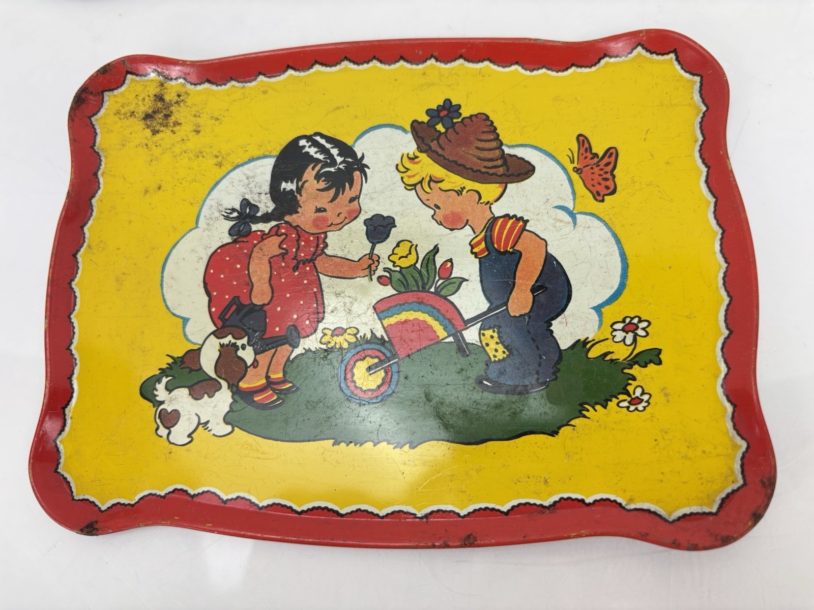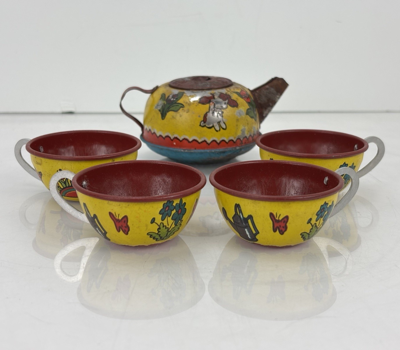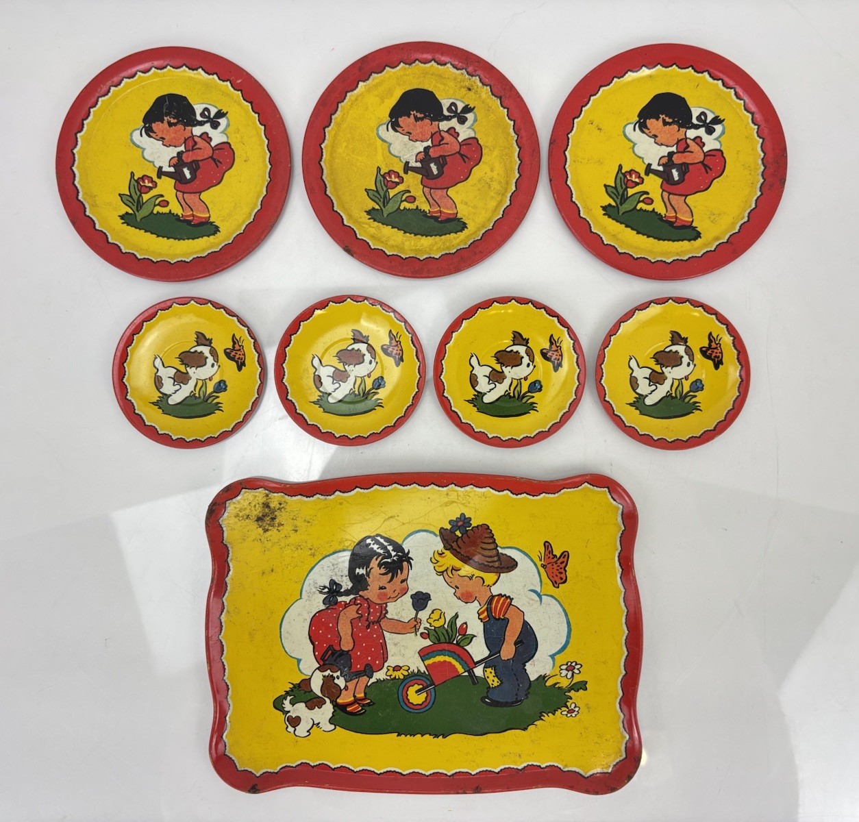 Vintage Ohio Art Girl Boy Garden No 173 Tin LItho Tea Set Tray Plate Cup Teapot