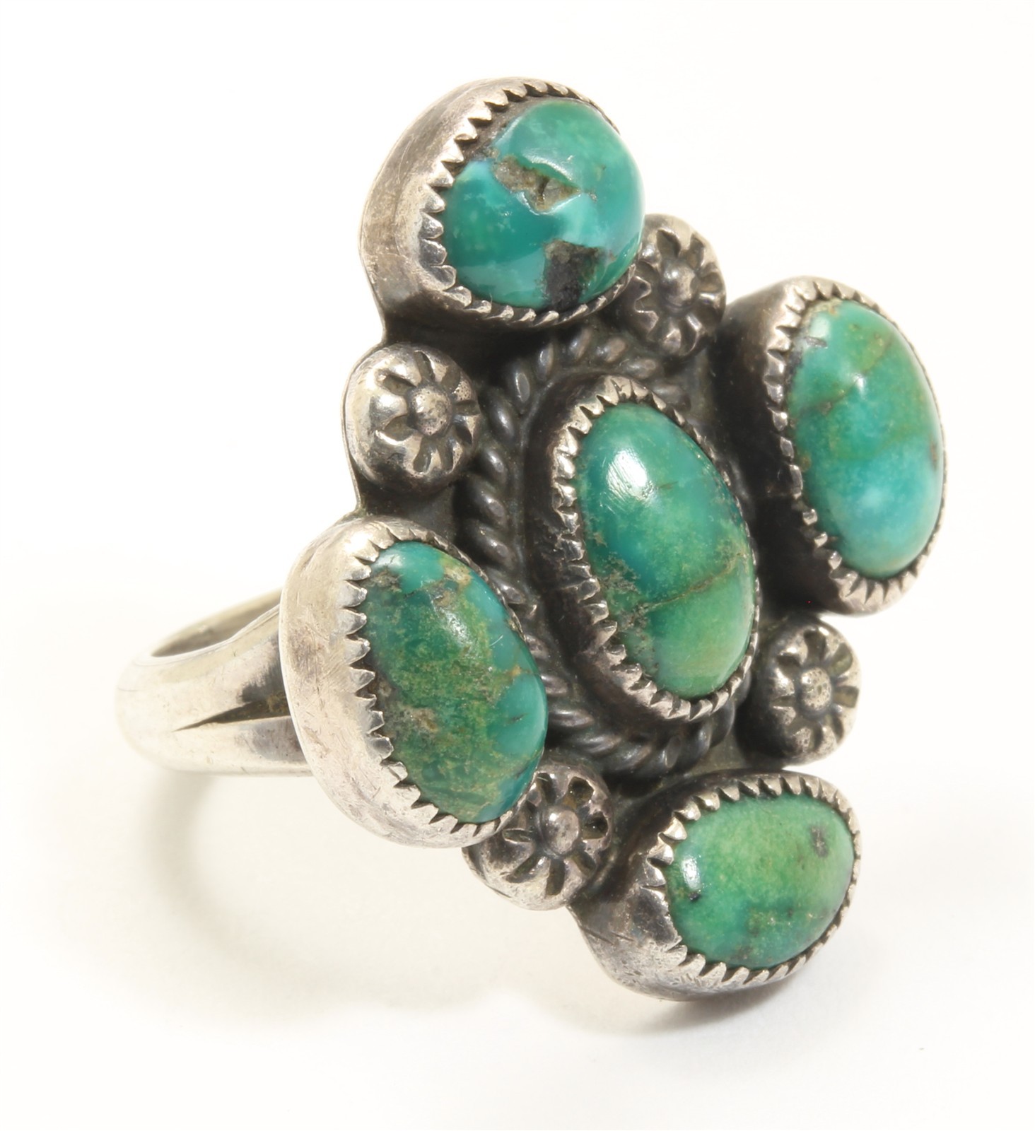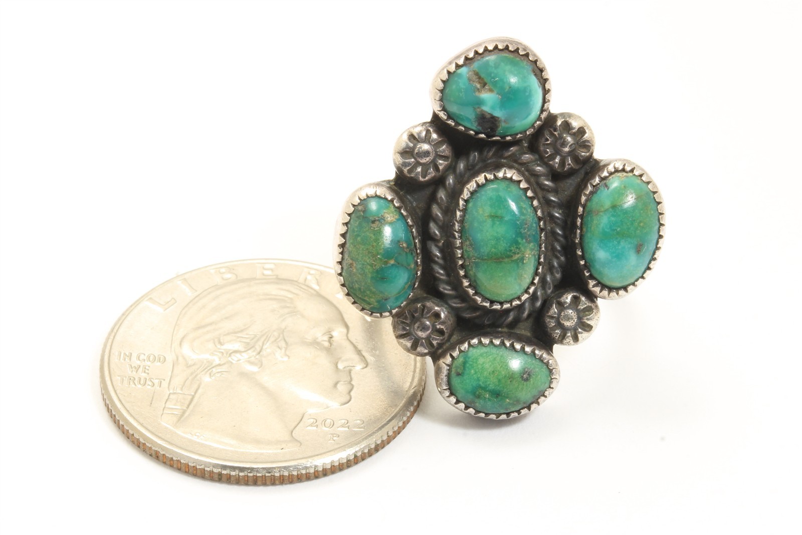 Vintage Navajo SIGNED Sterling Silver Green Turquoise Cluster Ring Sz5.25