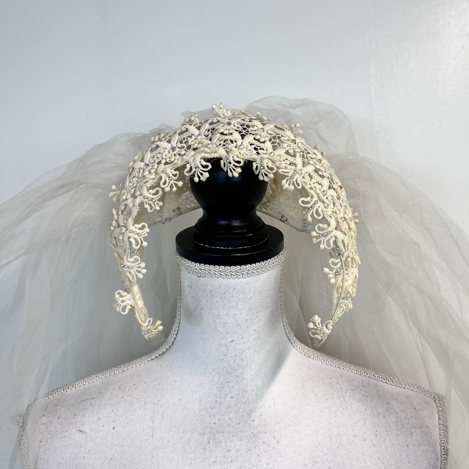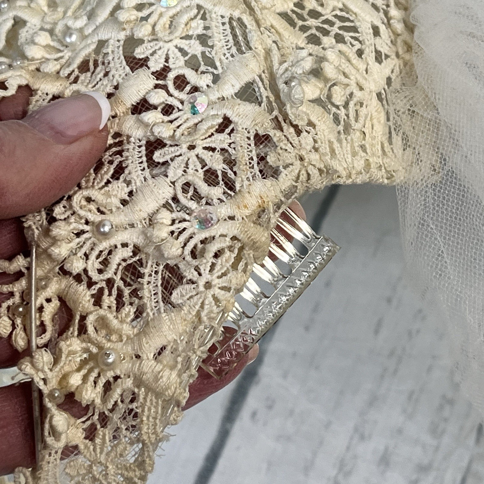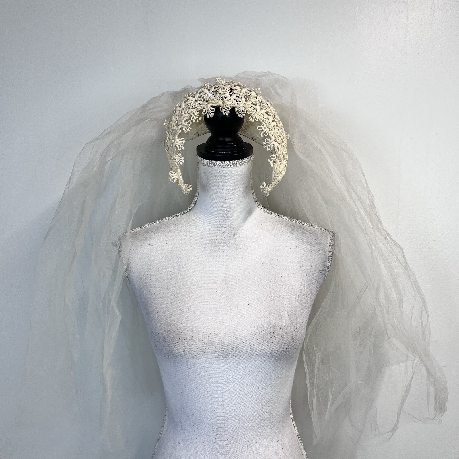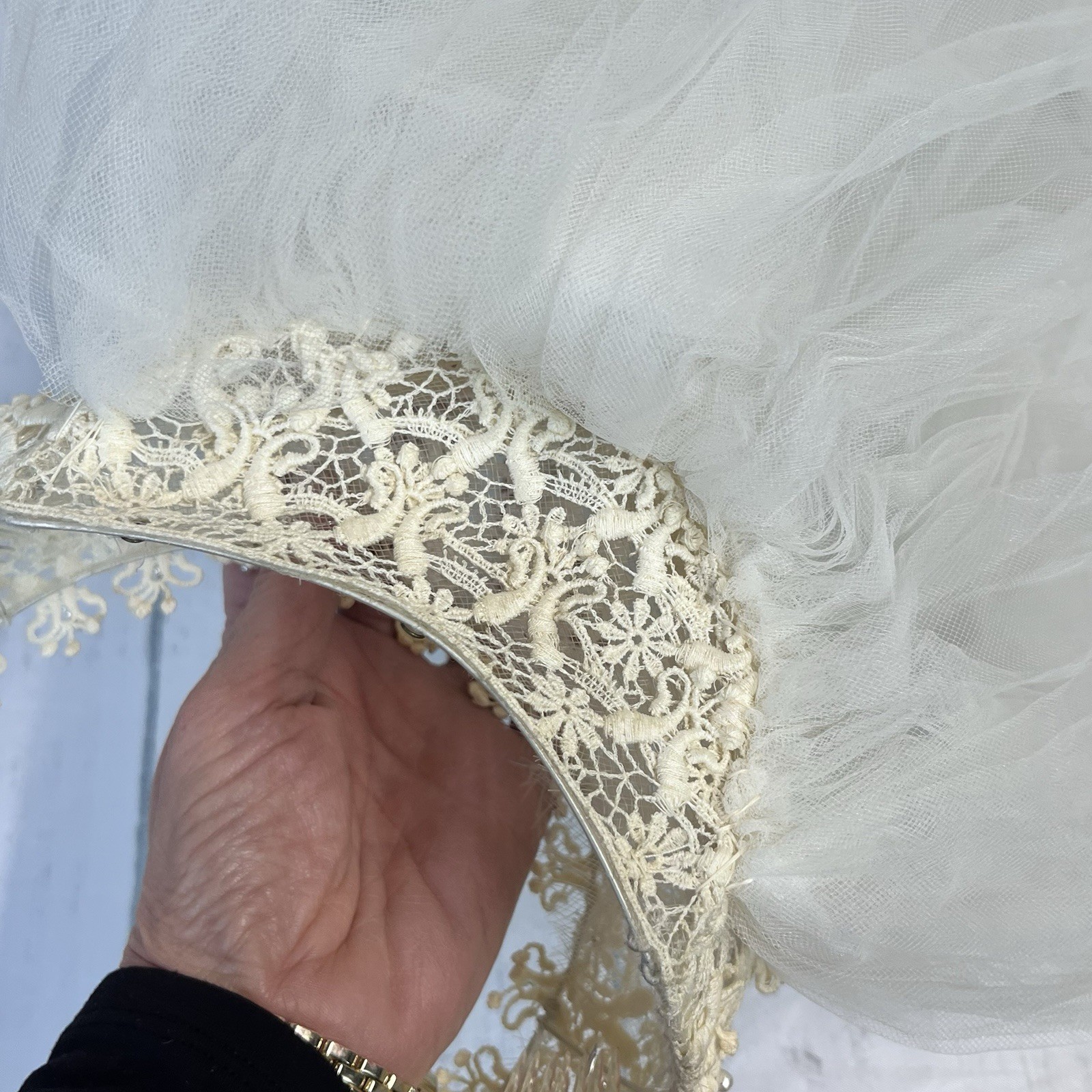 Vintage Ivory Blusher Bridal Veil 26 Lace Beaded Cap Headpiece 40's 50's 60's