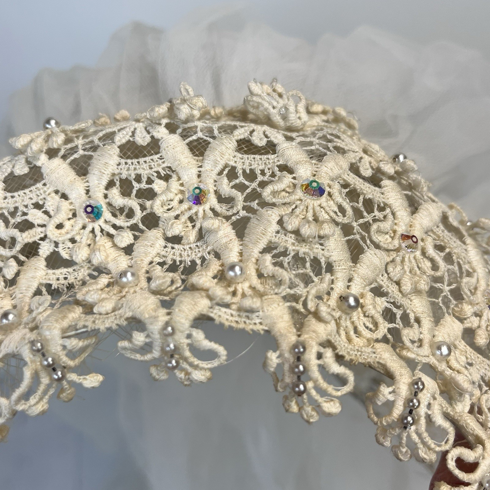 как выглядит Vintage Ivory Blusher Bridal Veil 26" Lace Beaded Cap Headpiece 40s 50s 60s фото
