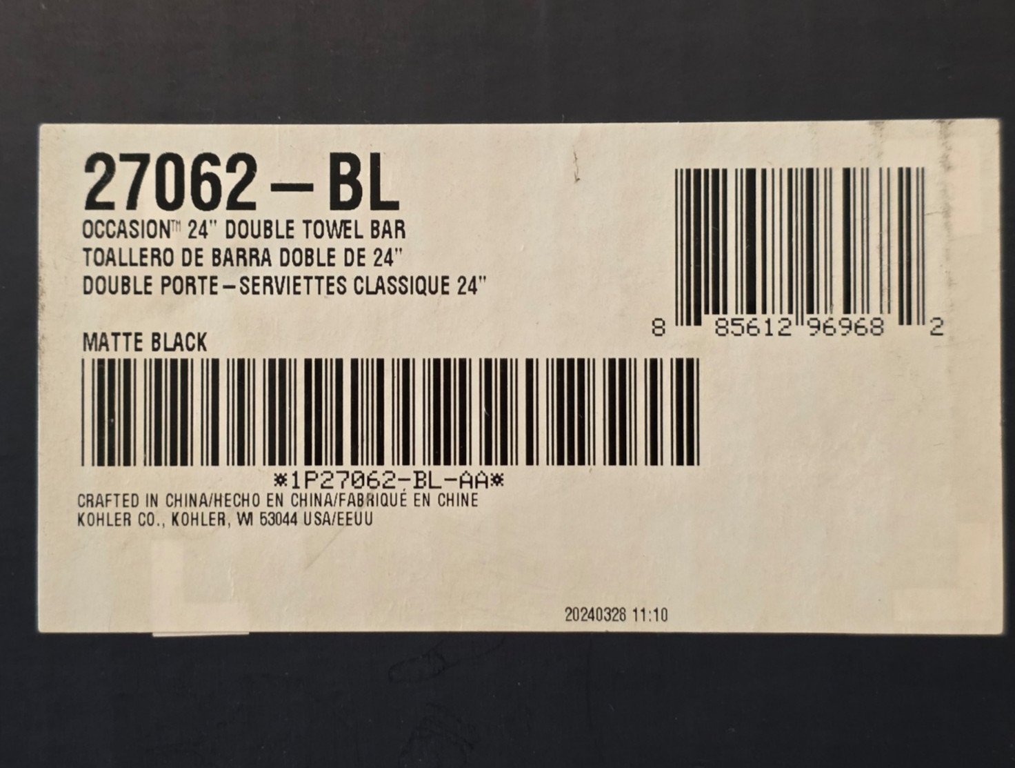 KOHLER 27062-BL Occasion 24 in. Wall Mounted Double Towel Bar in Matte Black