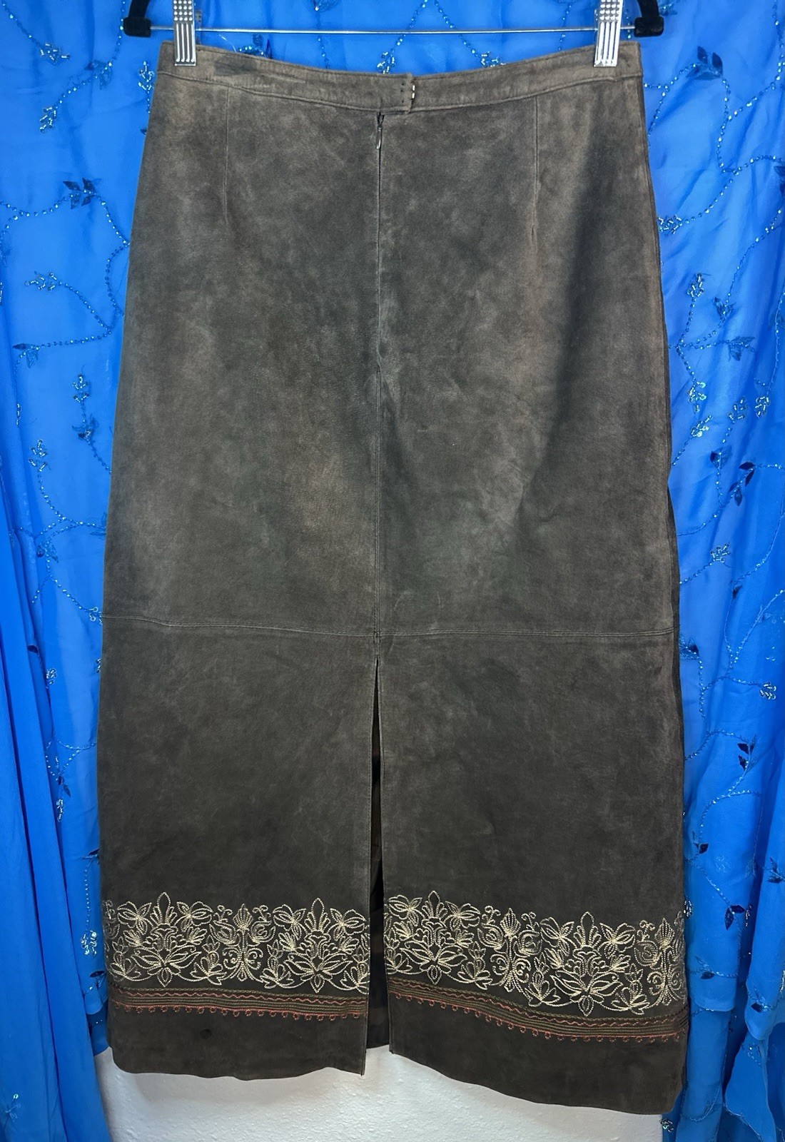 Vintage Brandon Thomas Leather Suede Brown Embroidered Maxi Skirt 16