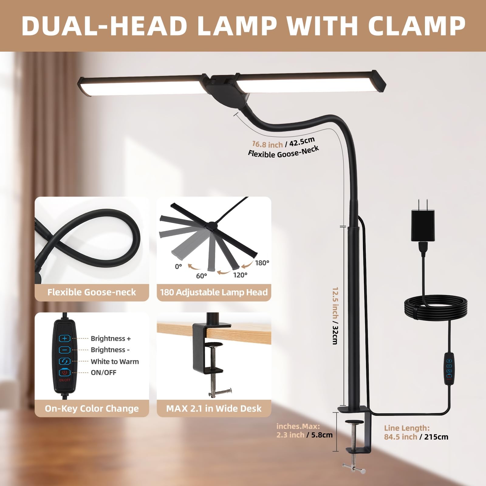 Included Components: Double Head Led Desk Lamp, Adapter, User Manual
