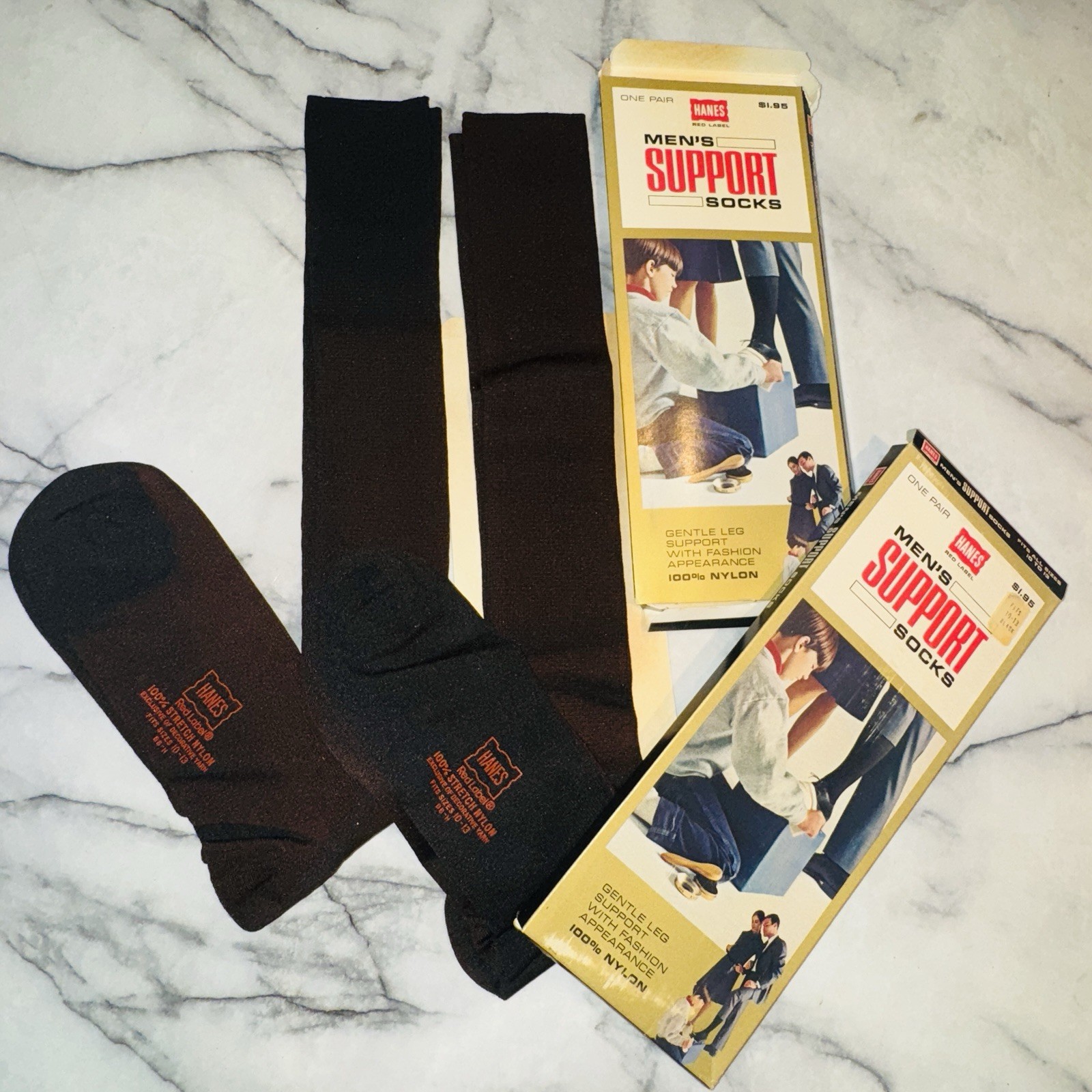 2 New 1960 Vintage Hanes Red Label Mens Support Socks Nylon Black Men's Ephemera