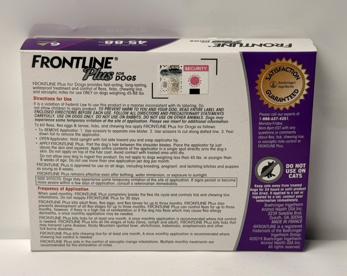 FRONTLINE PLUS DOGS 45-88Lbs FLEA TICK CONTROL 6 DOSES BRAND NEW, SEALED