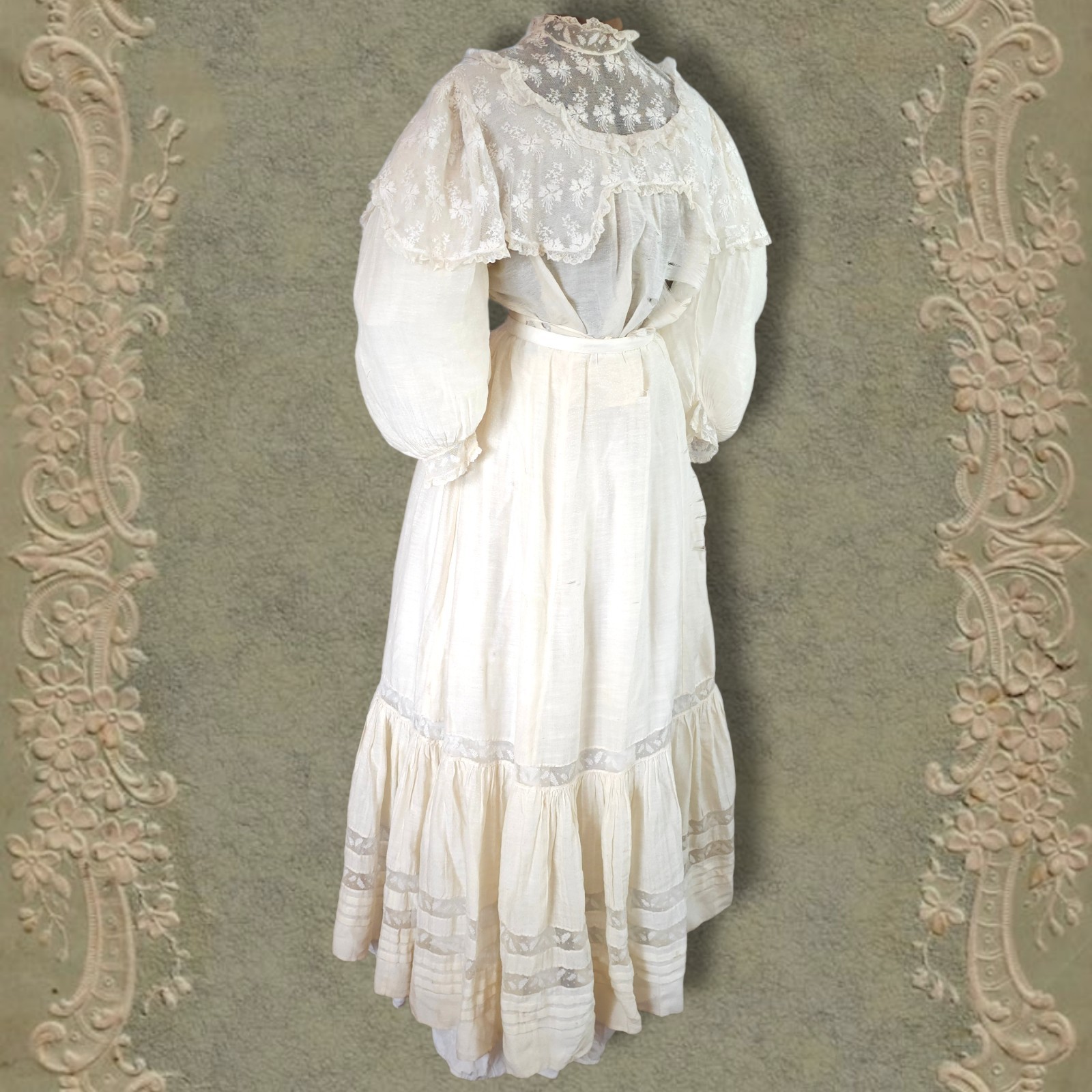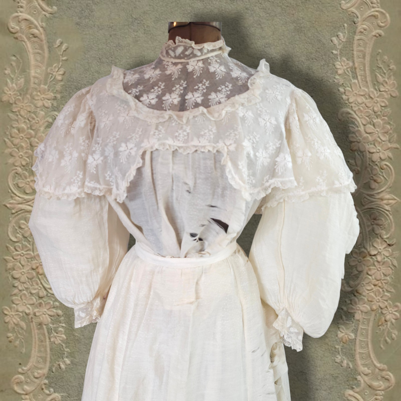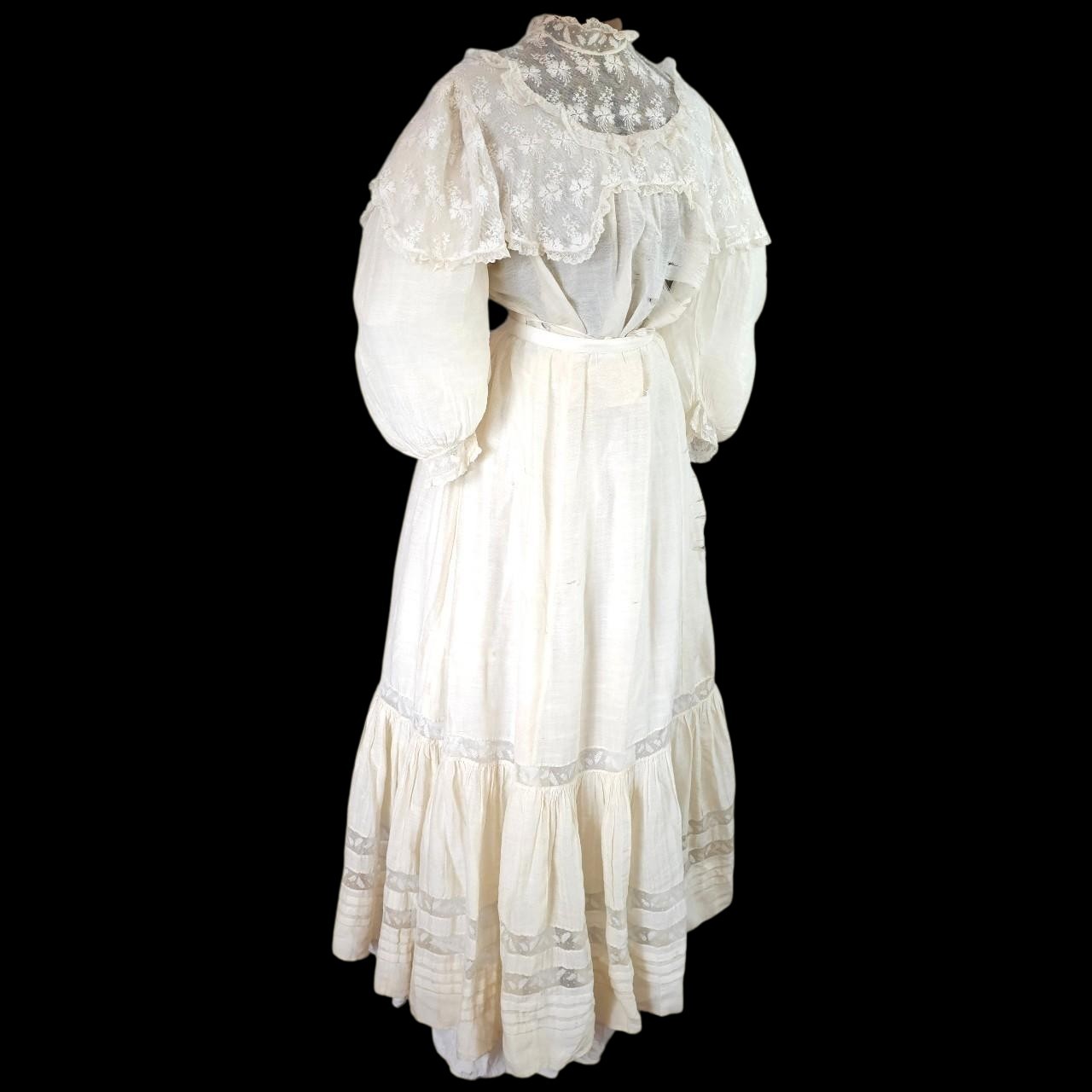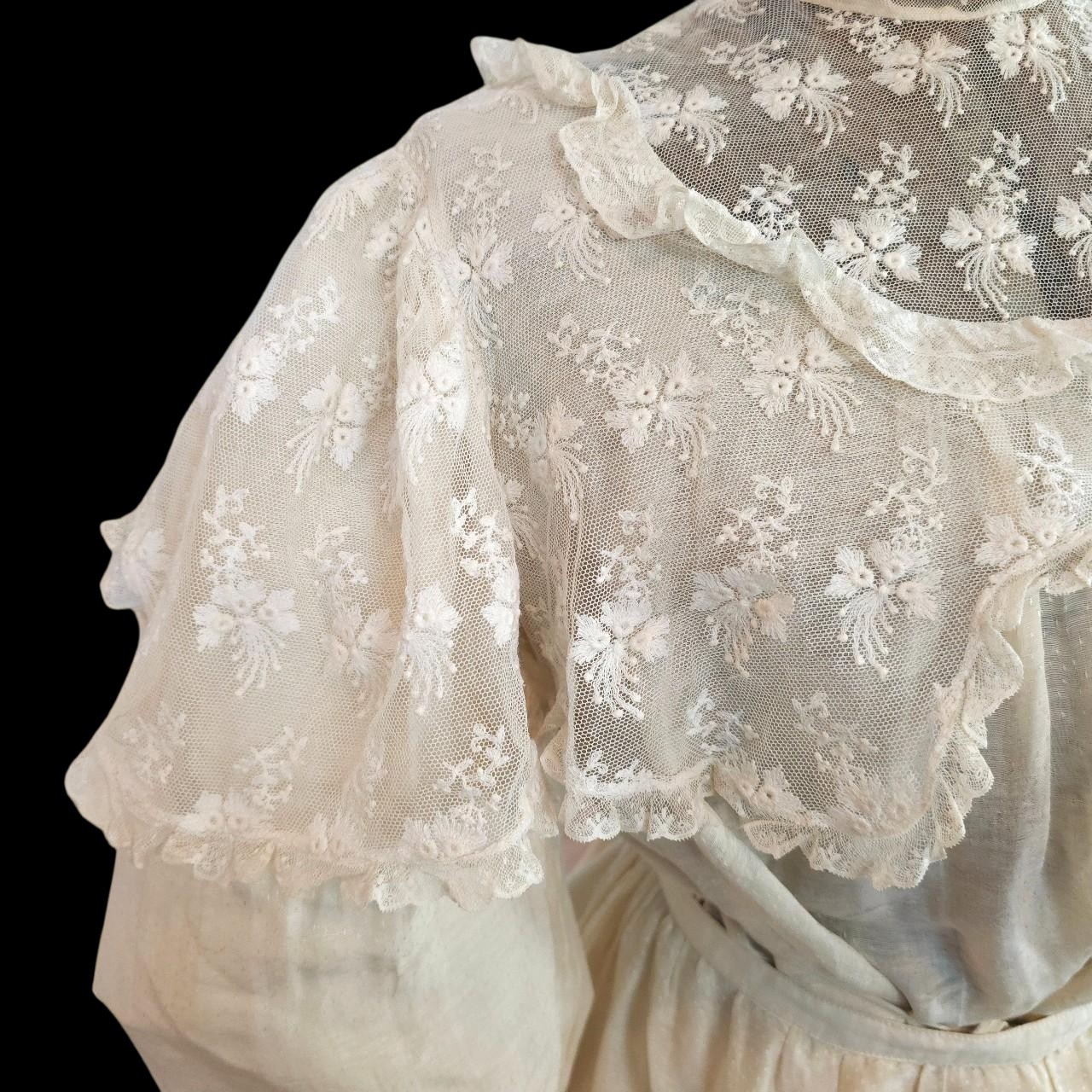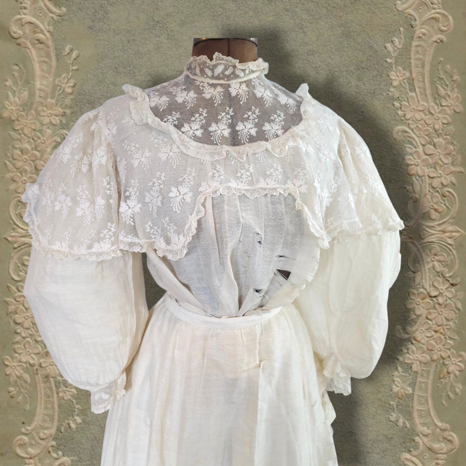 как выглядит 1910s Antique Edwardian 2 Pc Large Puff Sleeve Lace Cape Dress Gown White AS IS фото