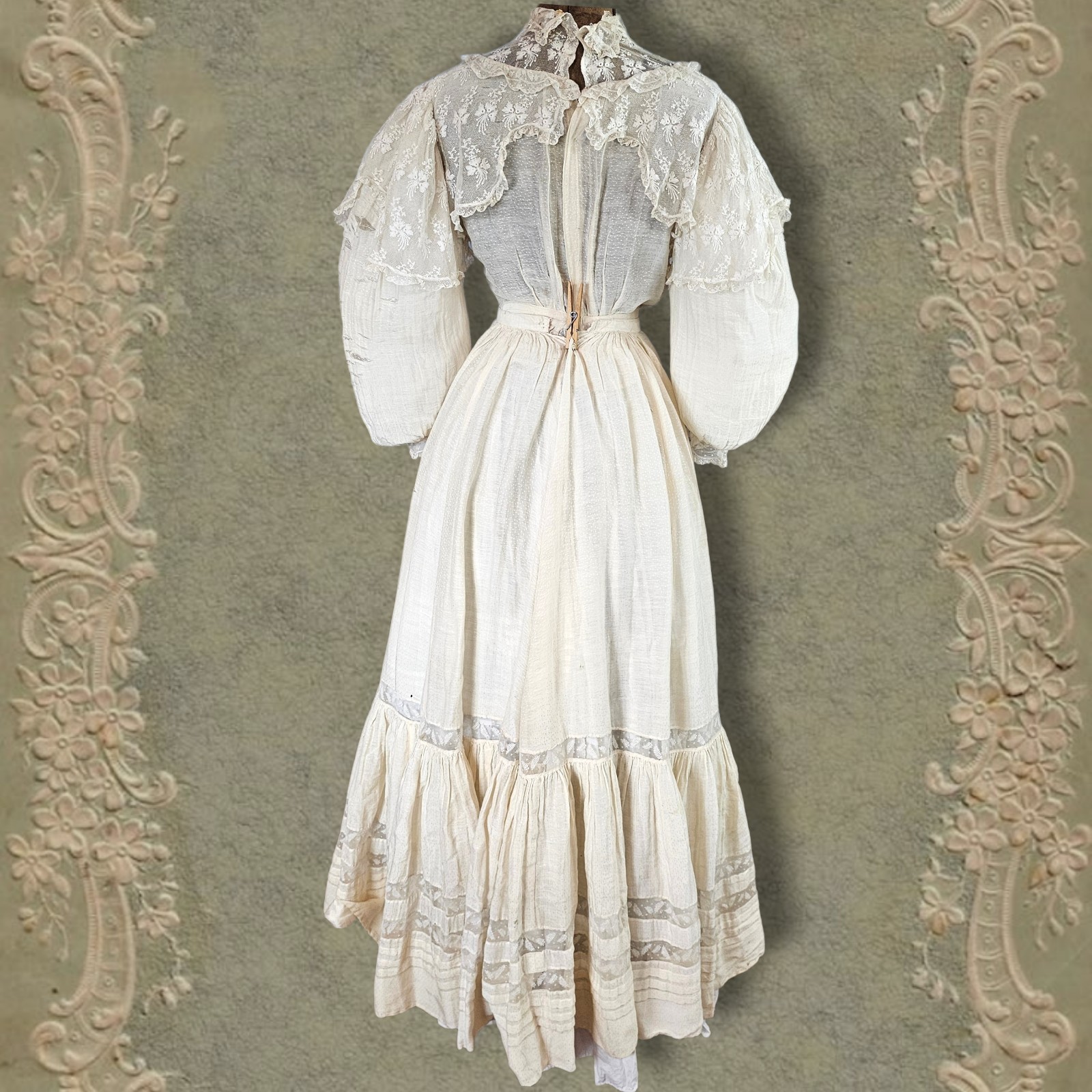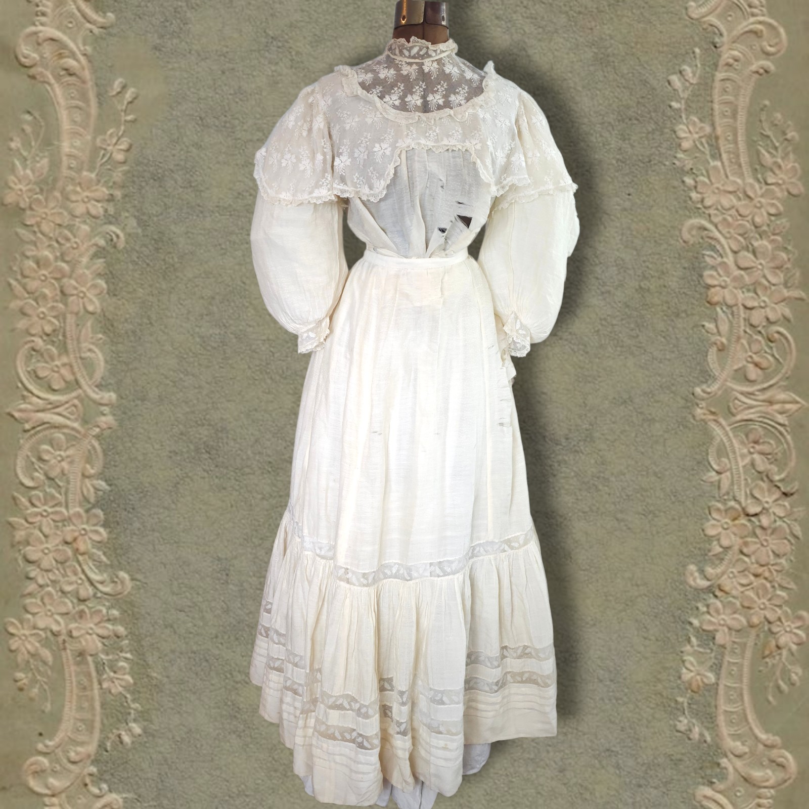 1910s Antique Edwardian 2 Pc Large Puff Sleeve Lace Cape Dress Gown White AS IS