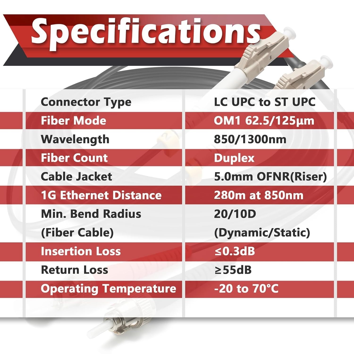 75m OM1 LC to ST Duplex Fiber Optic Cable OFNR 62.5/125 Multimode