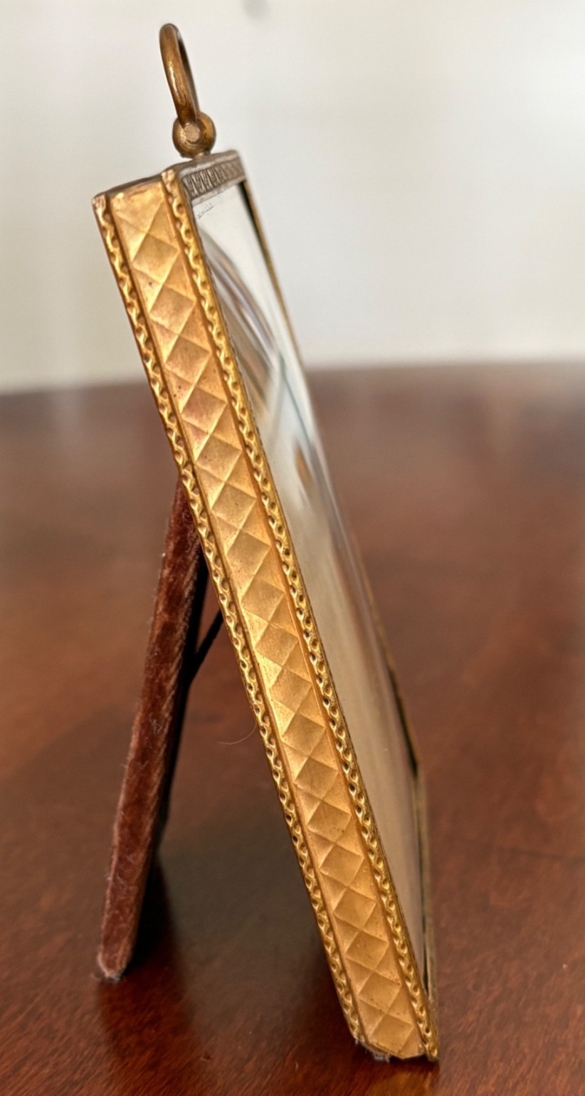 как выглядит Vtg Gold Metal Picture Frame Convex Glass Velvet Easel Holds 3x4 Photo фото