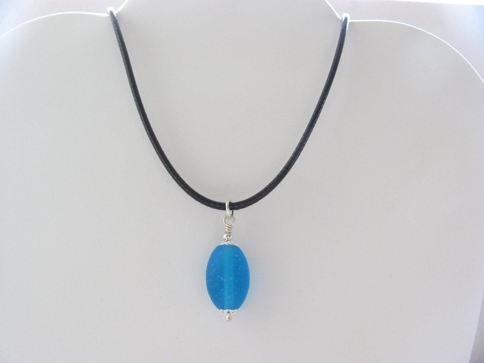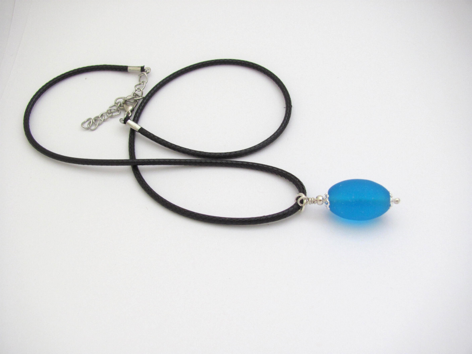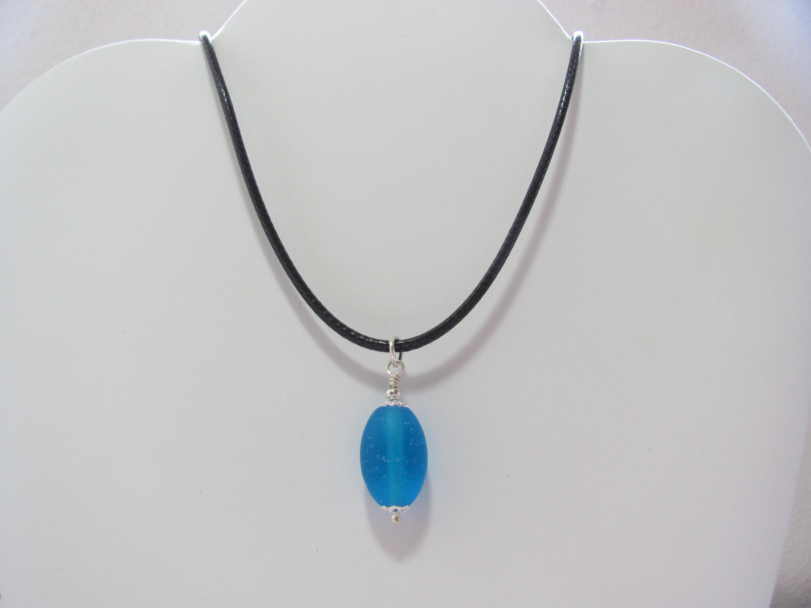 Aqua Sea Glass Necklace Black Cord Unisex Jewelry Pendant Summer Beach Gift