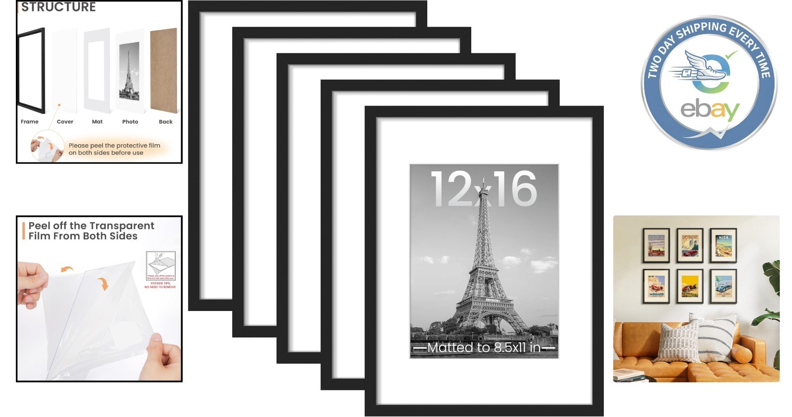 Classic Black Picture Frame Set of 5 for 12x16 or 8.5x11 Prints - Wall Mount