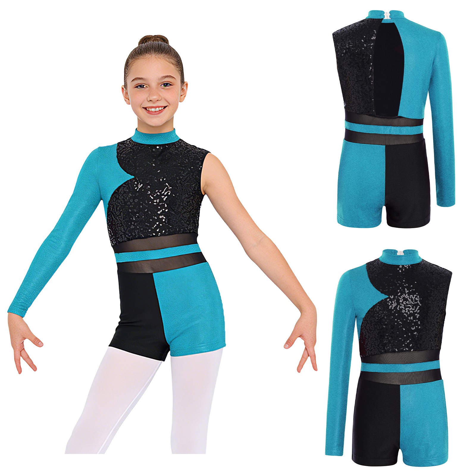 Kids Girls Dancewear Workout Leotard Metallic Jumpsuit Figure Ice Skating Show