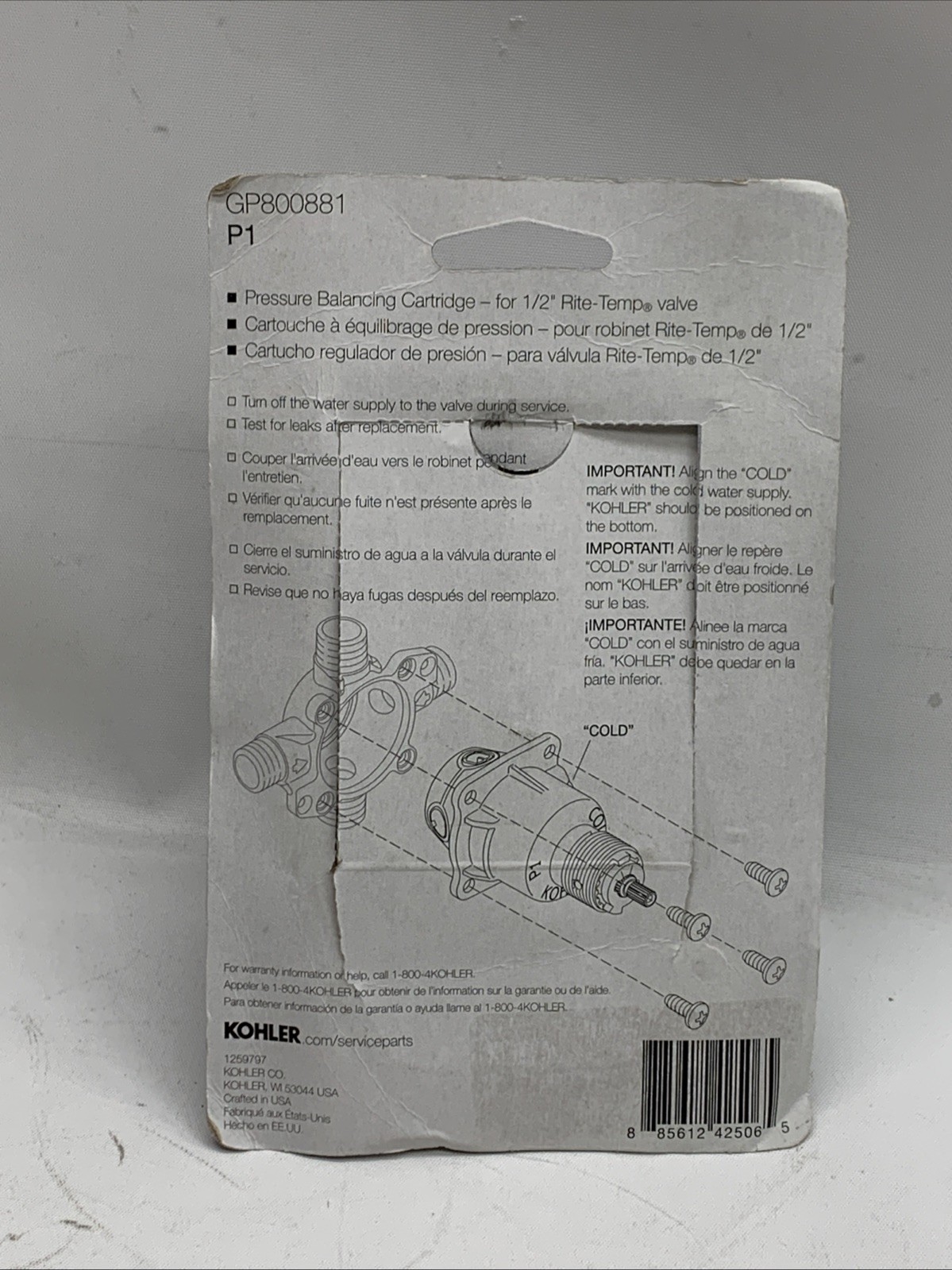 KOHLER Rite-Temp Pressure Balance Cartridge Genuine Part GP800881 1-Piece Design