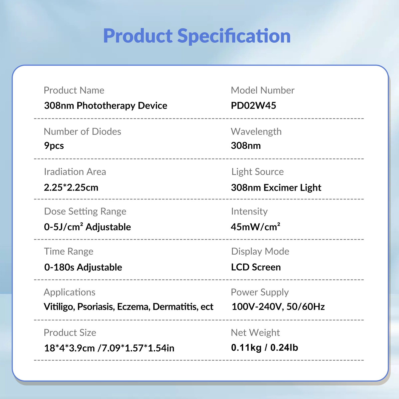 Dose Setting: 0-5J/cm² Adjustable
