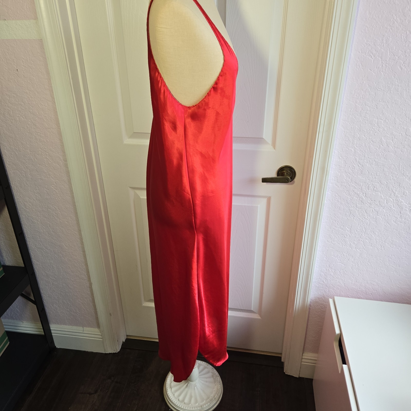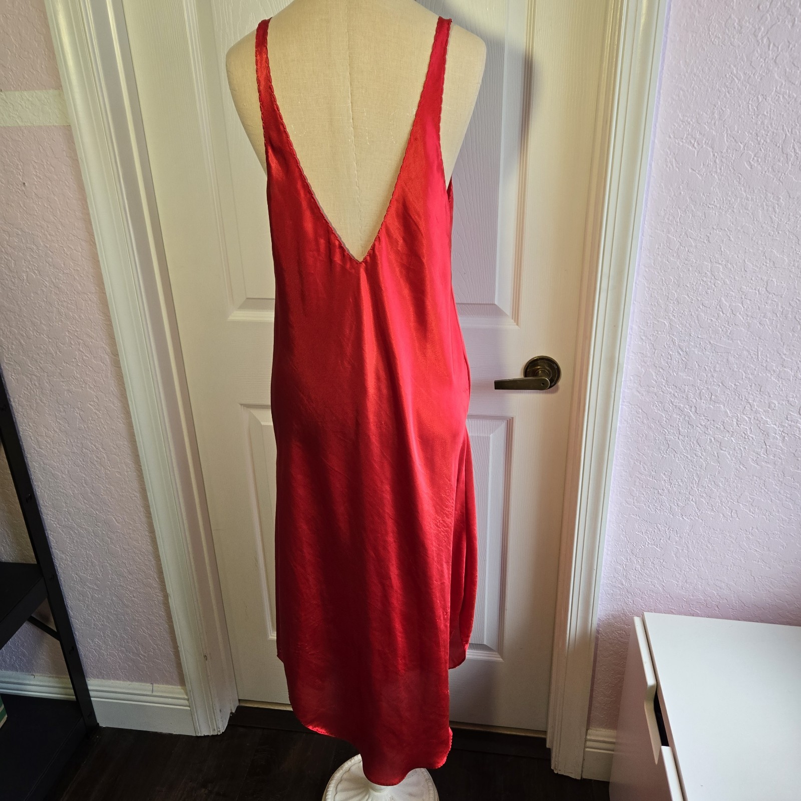 как выглядит Cinema Etoile Vintage Red Satin Long Chemise Deep V Front And Back Size M USA фото