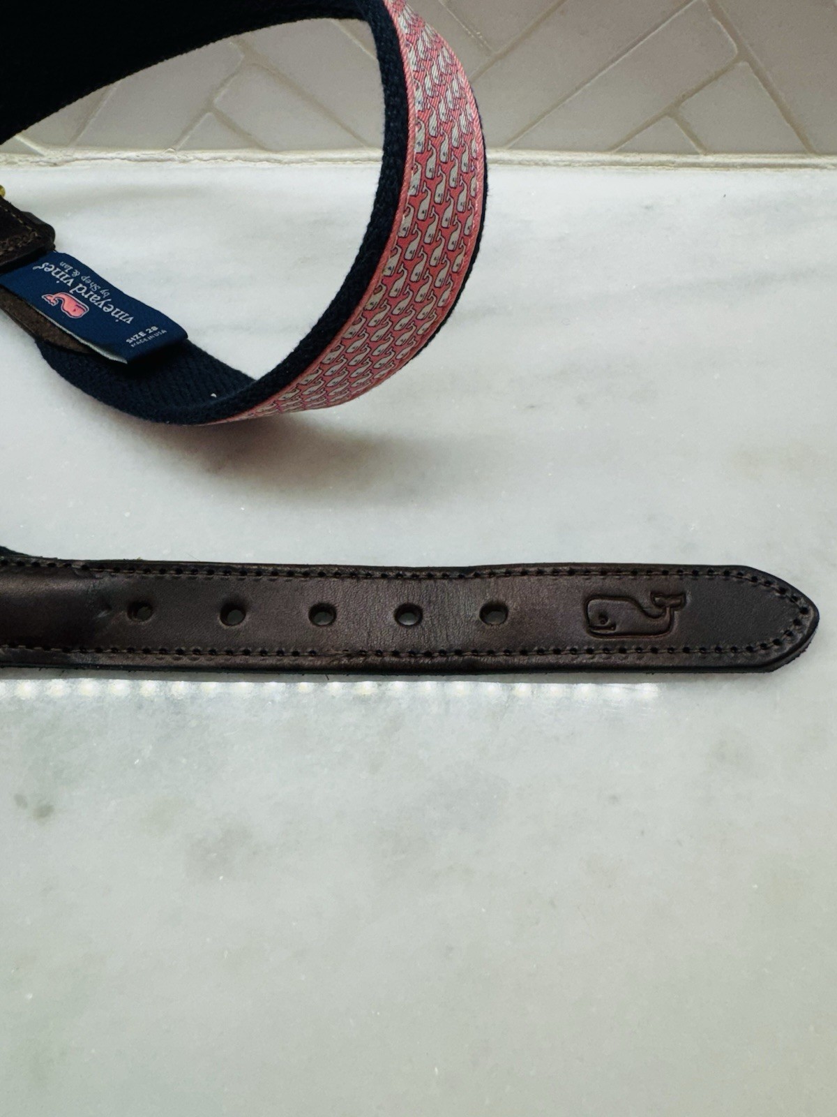 как выглядит Vineyard Vines Boys Classic Whale Canvas Club Belt Sz 28 Navy Pink Leather Brass фото