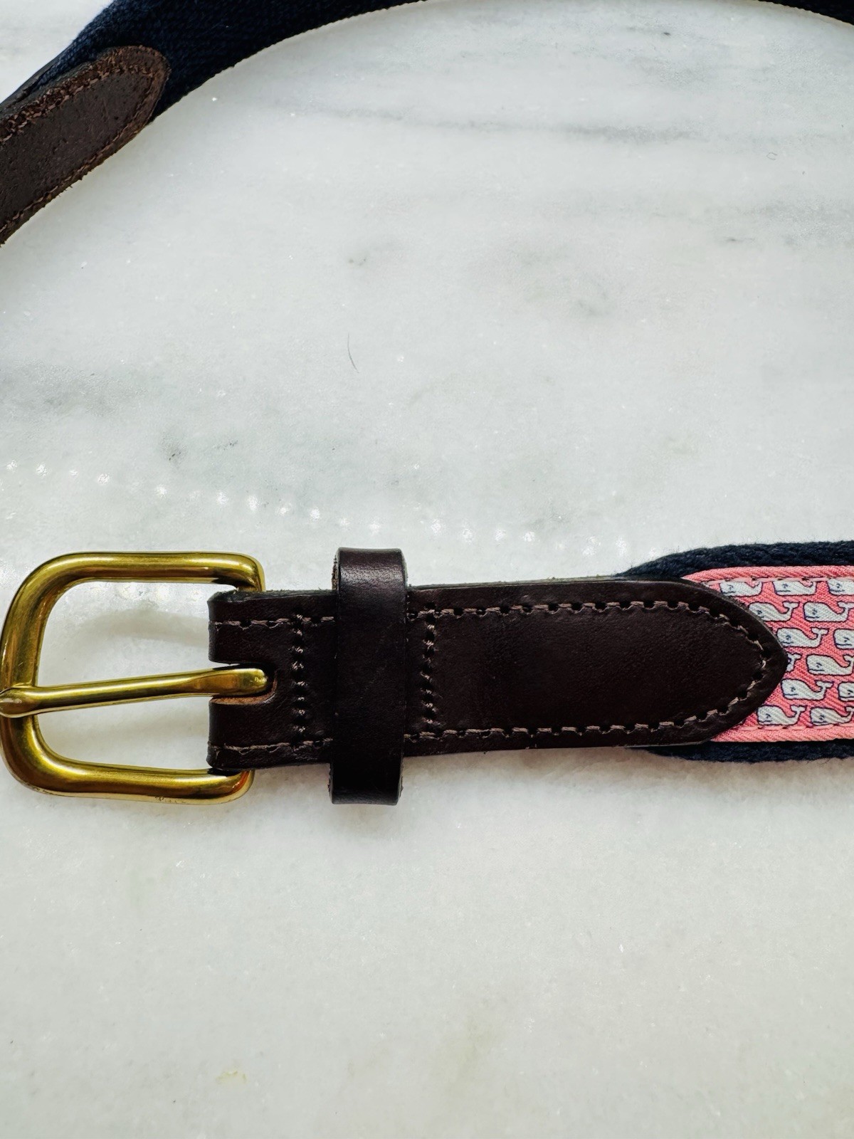 Vineyard Vines Boys Classic Whale Canvas Club Belt Sz 28 Navy Pink Leather Brass