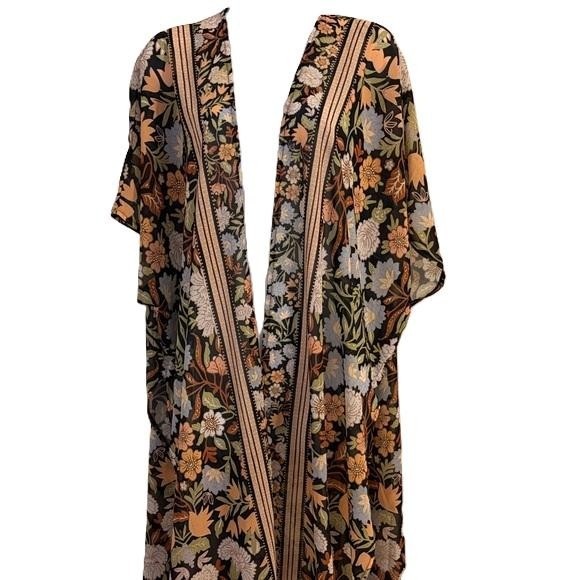 Flying Tomato Floral Kimono Duster Long Sleeve Open Front Black Multi Color M