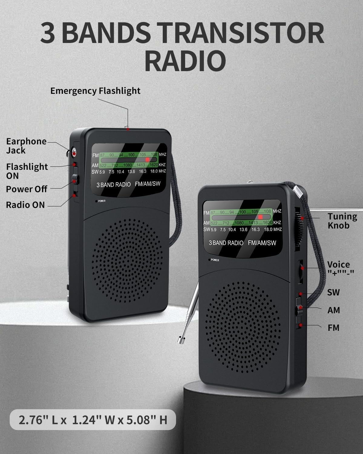 Display title in Boldface: FM AM SW Back Clip Pocket Radio