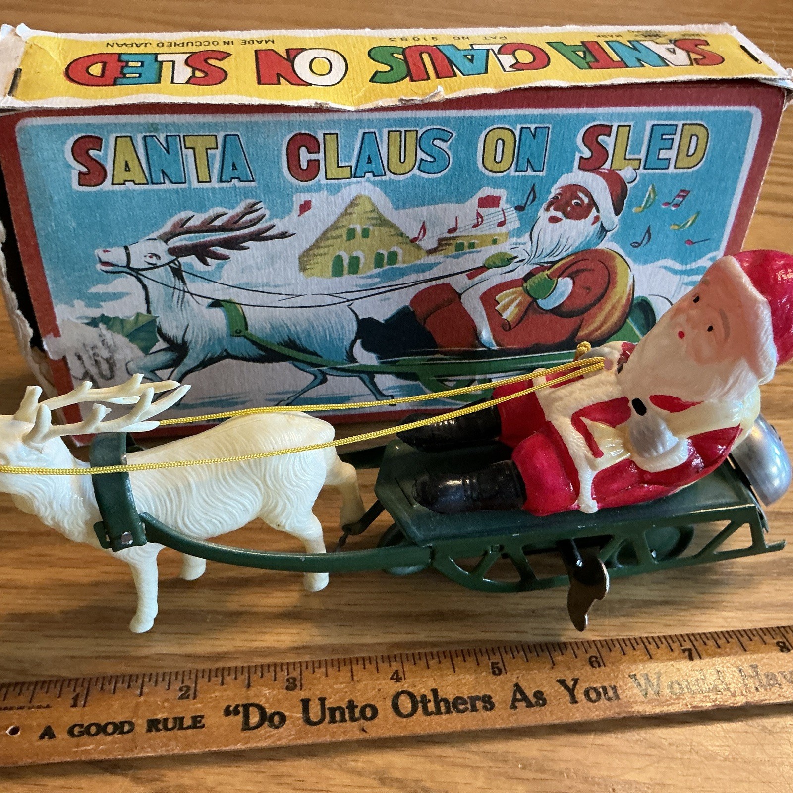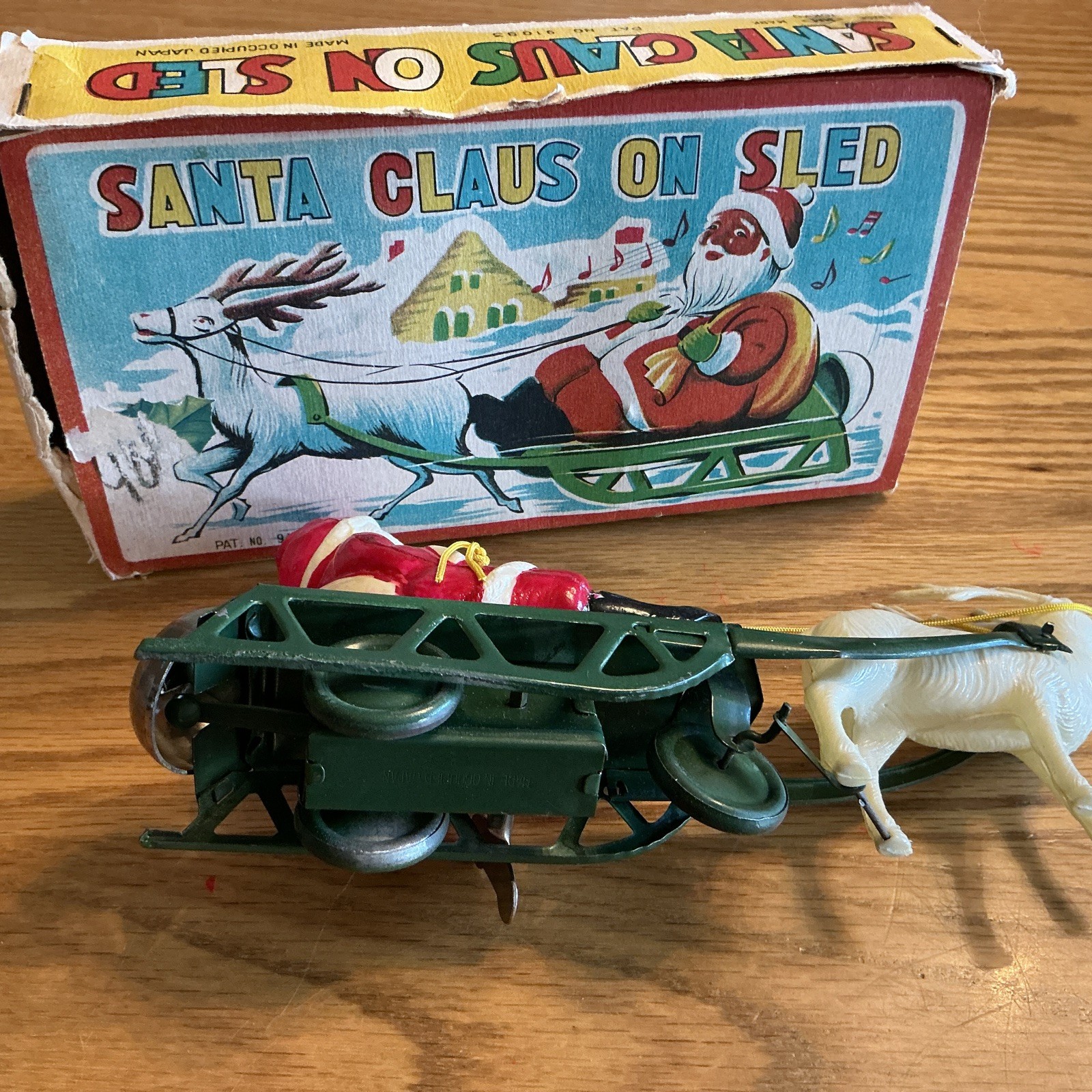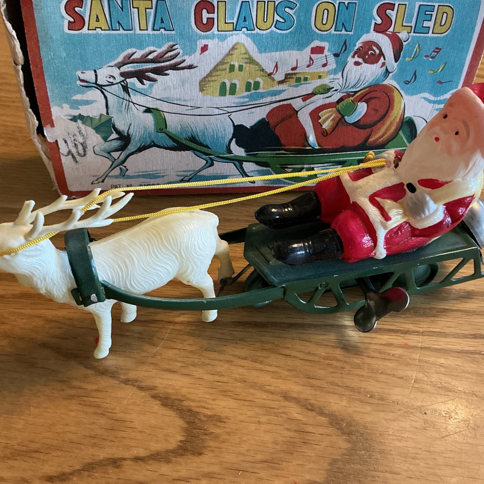 • WORKING W/BOX Vintage Celluloid Santa Reindeer W/Metal Sleigh Wind Up Toy