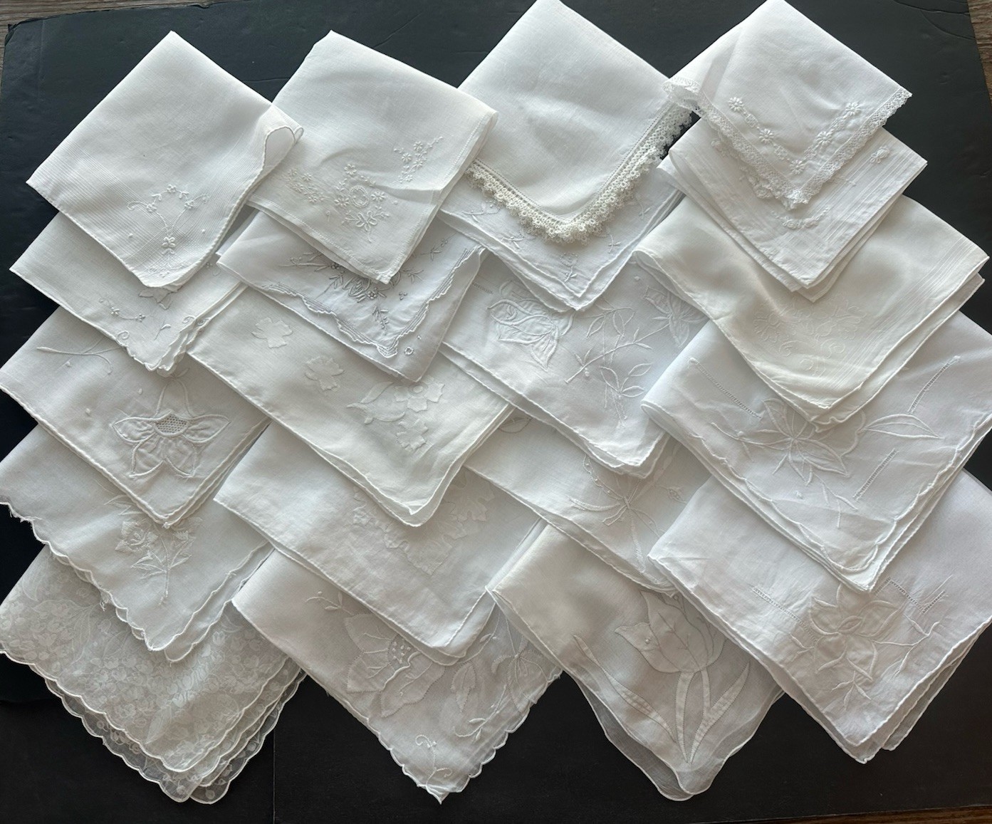 A Vintage Lot 20 White Hankies Hand Machine Embroidery Wedding Bride Clean