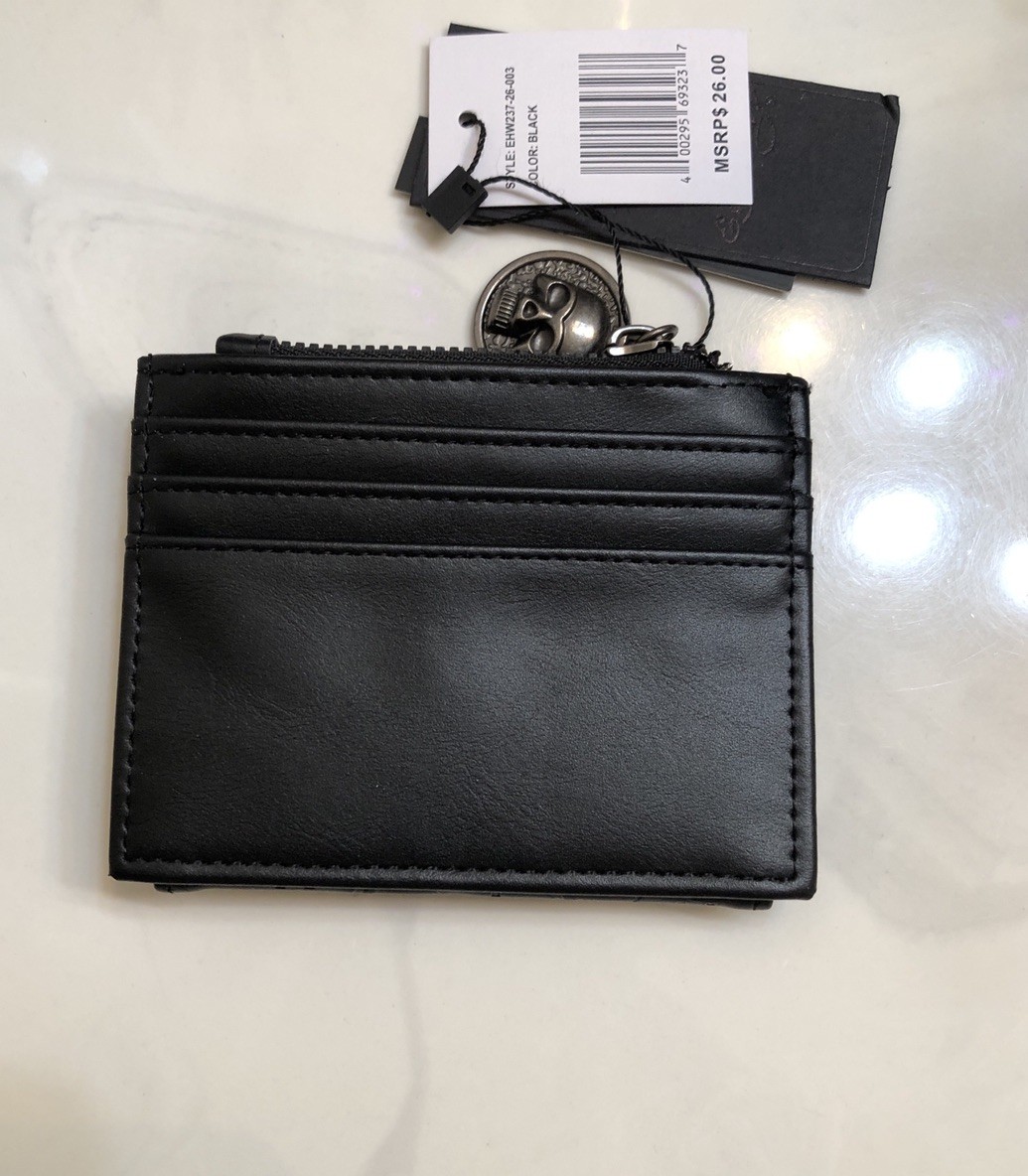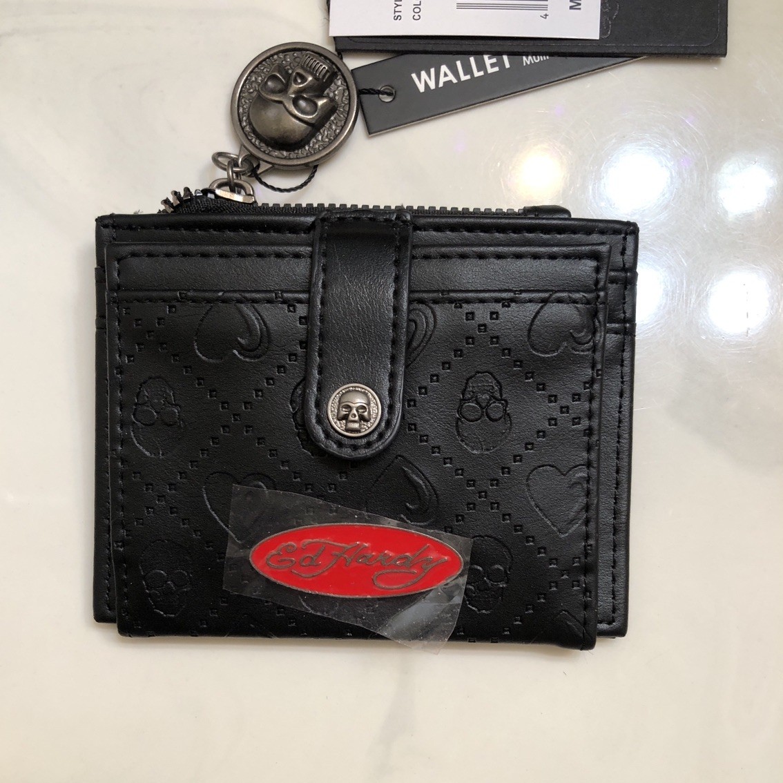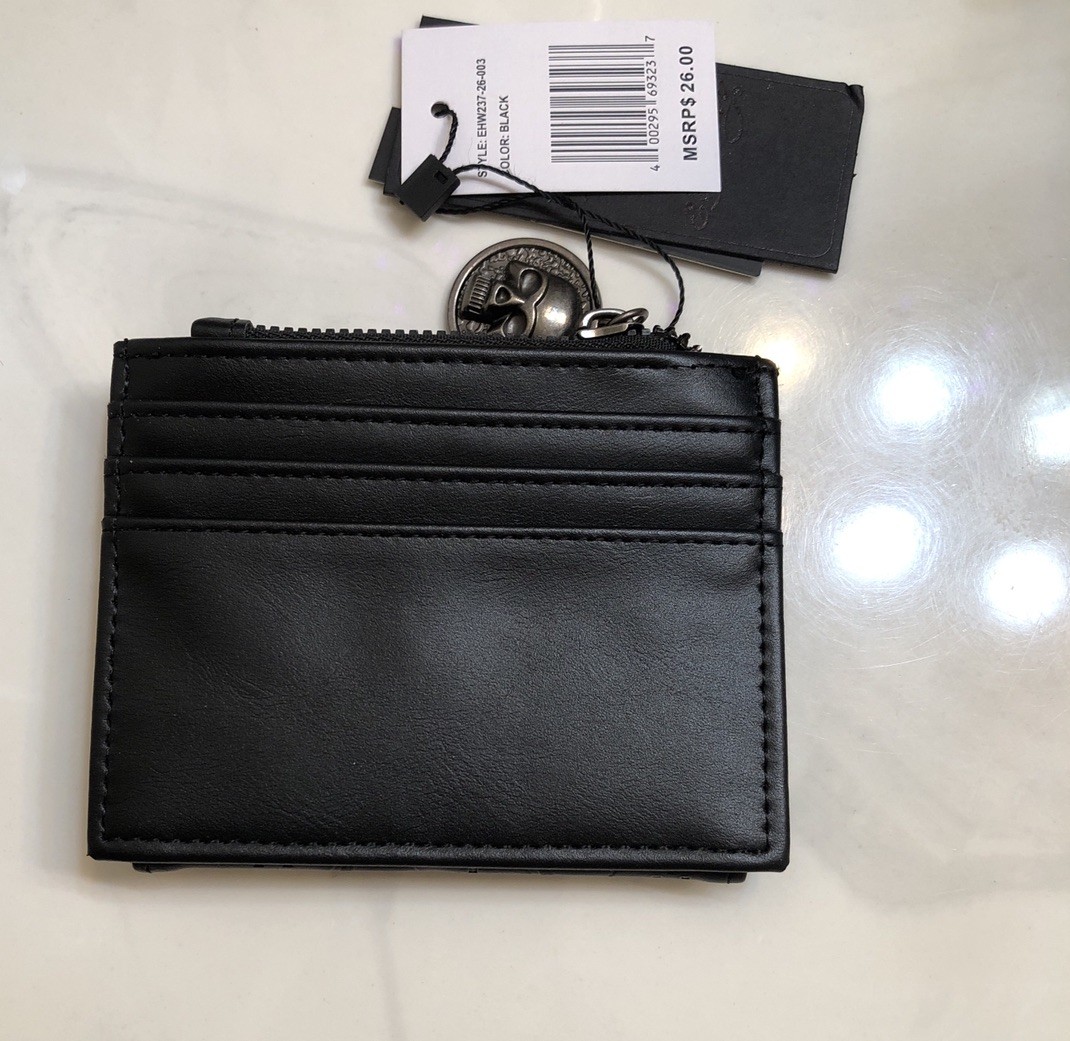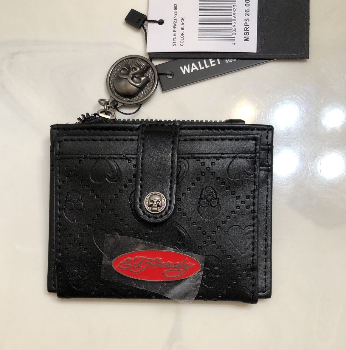 как выглядит Ed Hardy Black Faux Leather Card Wallet With Embossed Skulls Hearts NWT фото