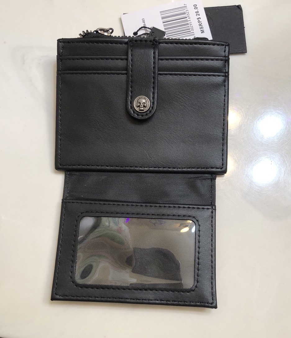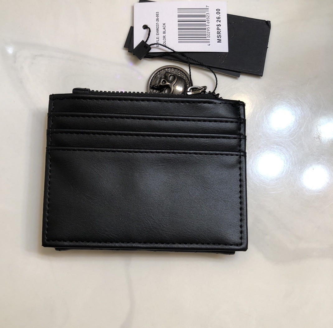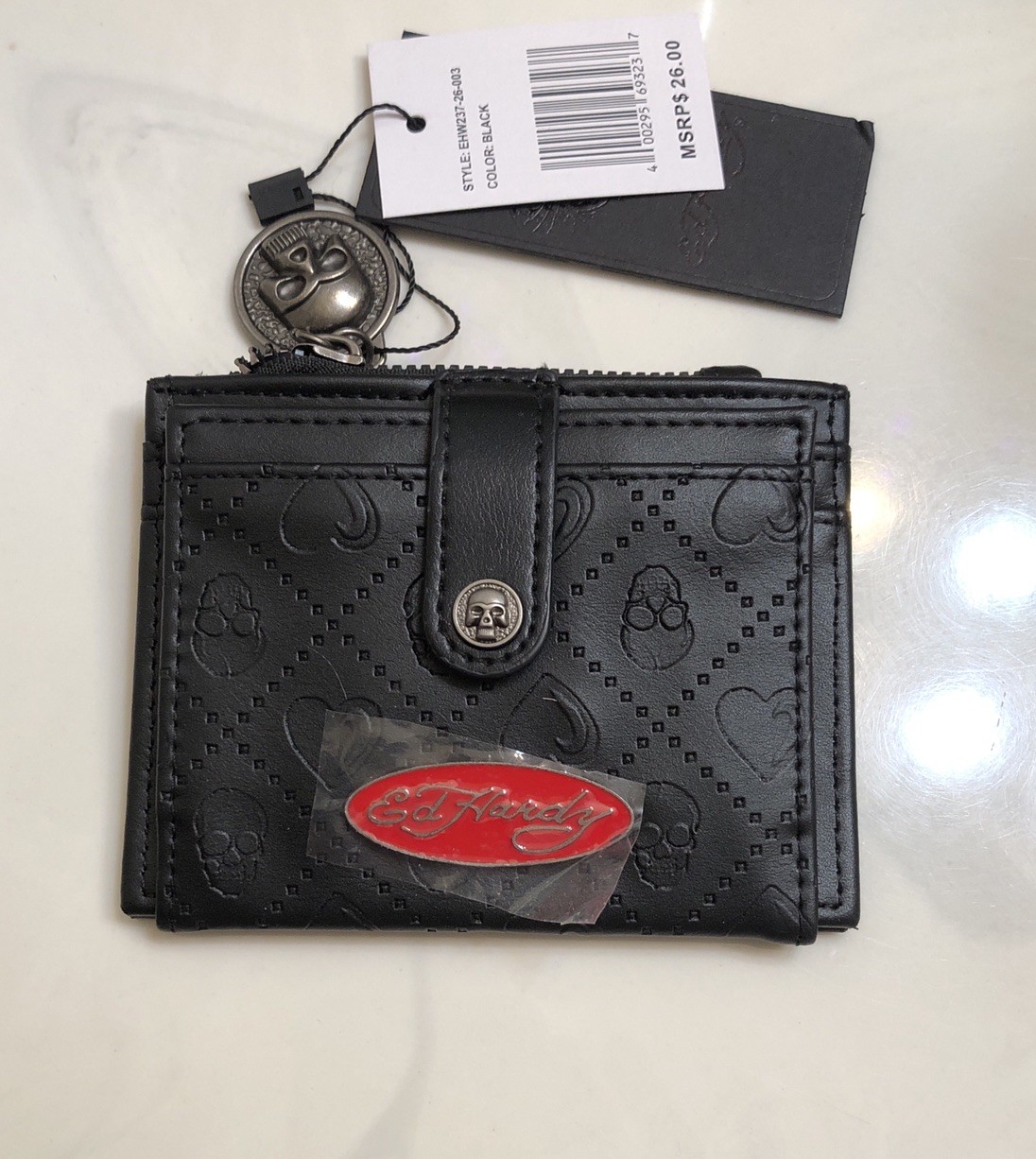 Ed Hardy Black Faux Leather Card Wallet With Embossed Skulls Hearts NWT