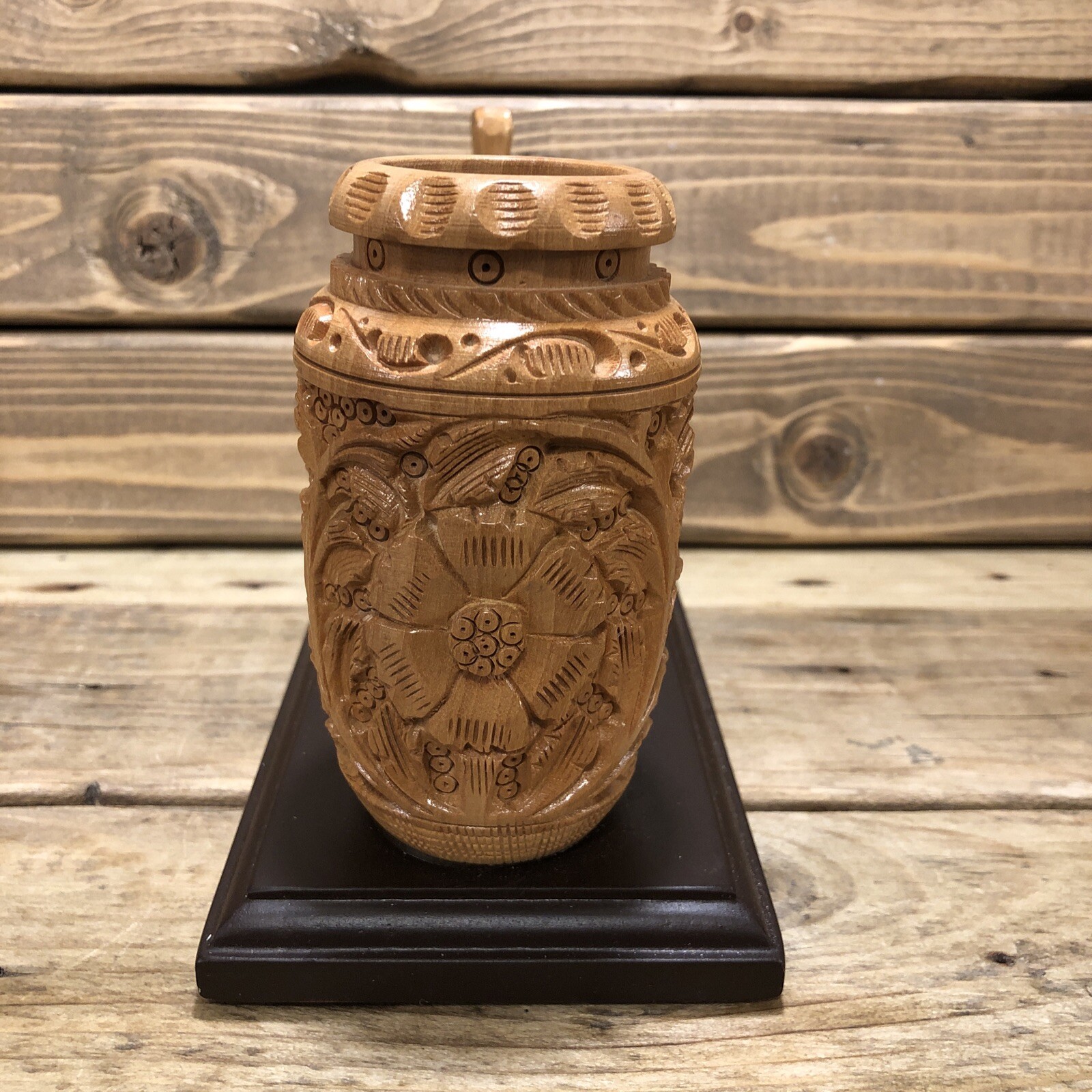 Wooden Elephant and Vase Undercut Hand Carved Statue India Art
