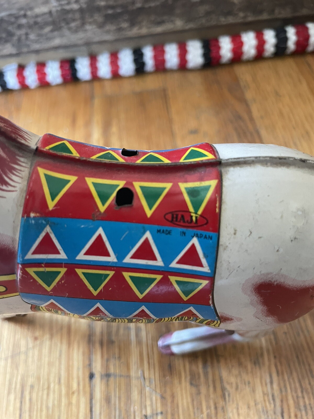 как выглядит VTG Haji Mark Litho Wind UP Jumping White Horse Tin Toy Japan Works See Video фото
