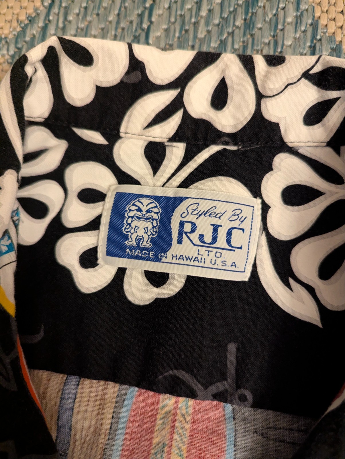 Vintage RJC Made in Hawaii Black Hawaiian Shirt XL Cotton Colorful Surfboard
