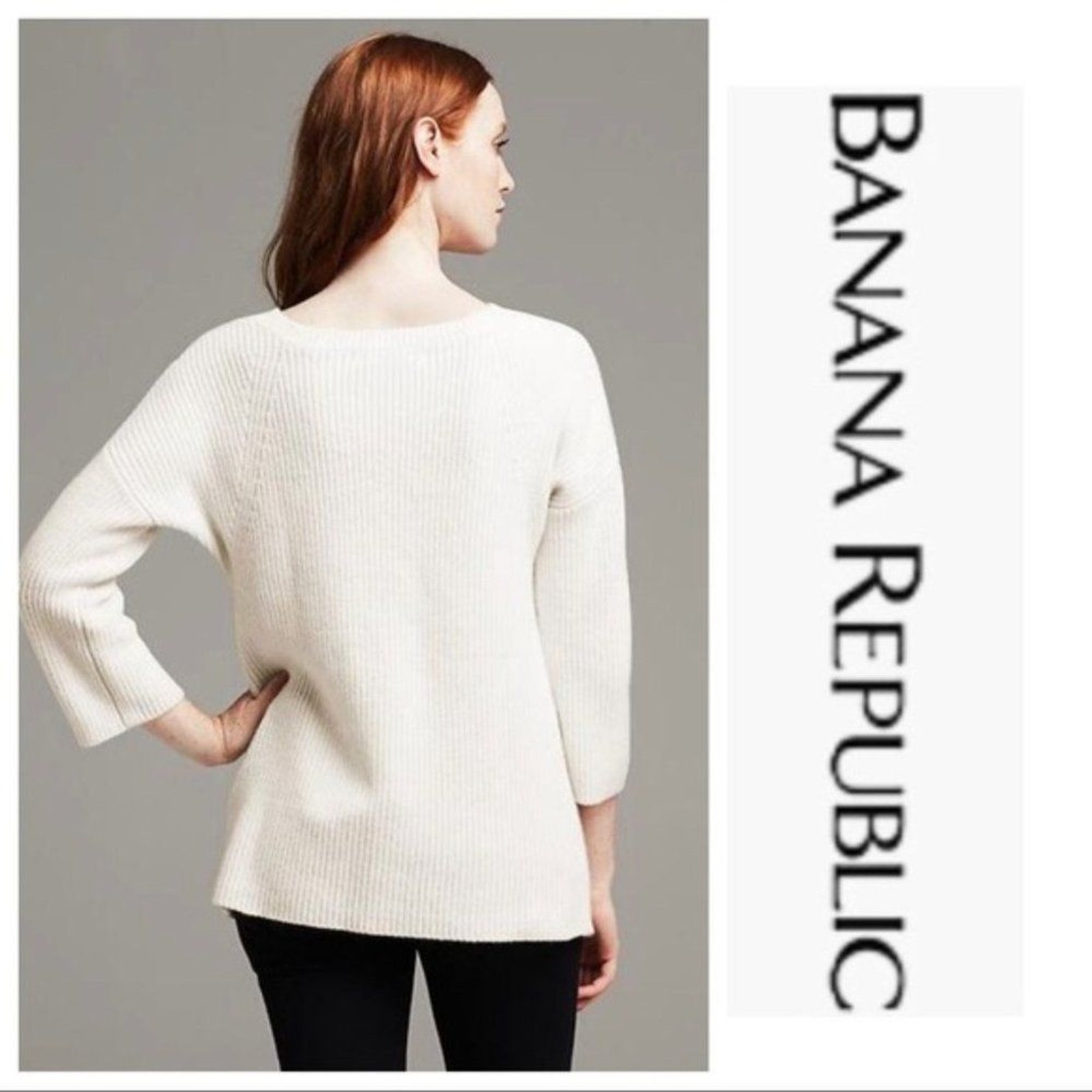как выглядит Banana Republic Ribbed 100 Cashmere Pullover Tunic 3/4 Sleeves - Off White - XS фото