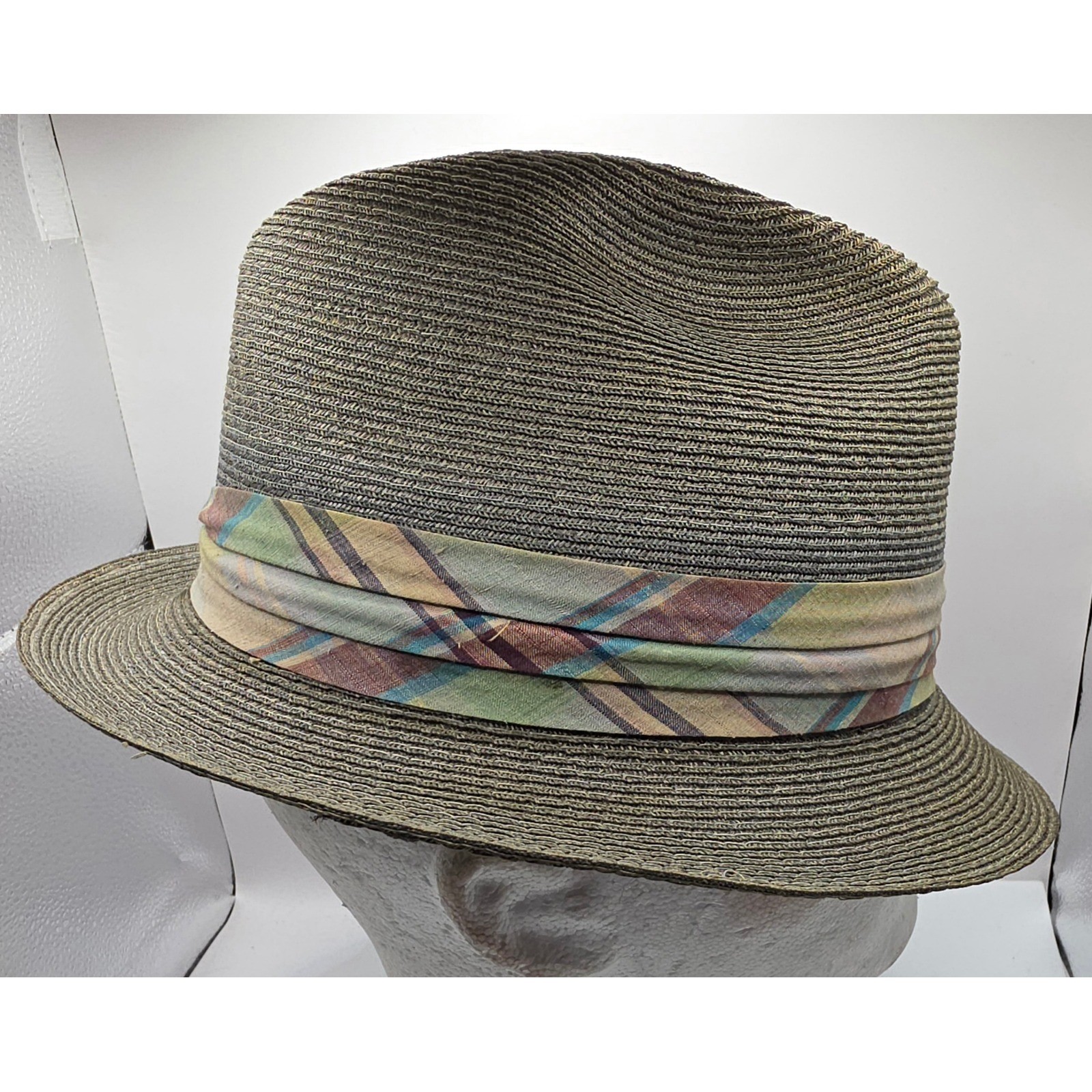 как выглядит Vintage Stetson Straw Panama Fedora Hat Gray Mens 7 1/8 Woven Pastel Plaid Band фото