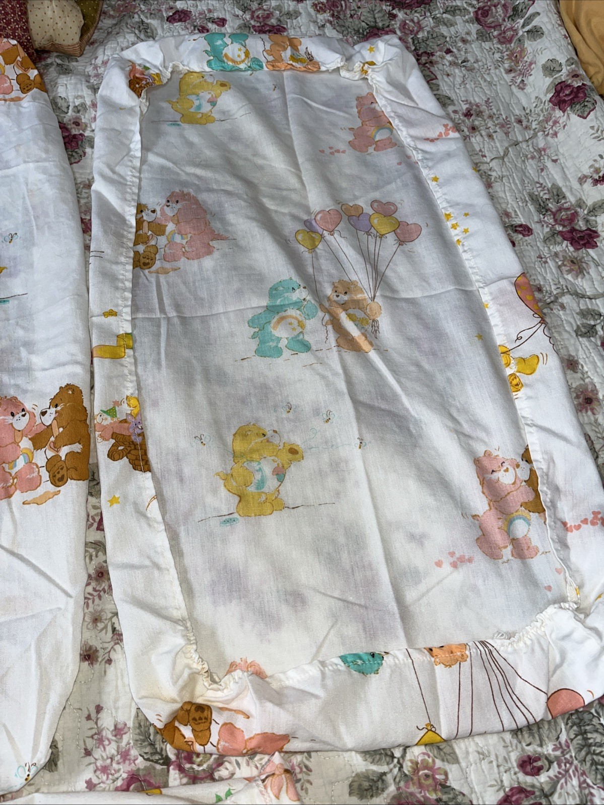 VTG 2 Bassinet Fitted Sheet 1 36 x40 Coverlet CARE BEAR Baby Bedding 1980s