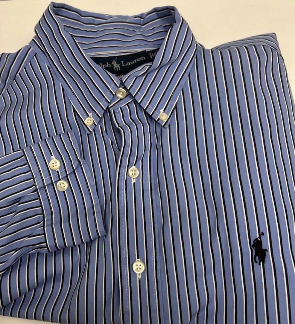 как выглядит Ralph Lauren Classic Fit Mens 16 1/2 Blue Stripe Long Sleeve Button Down Shirt фото