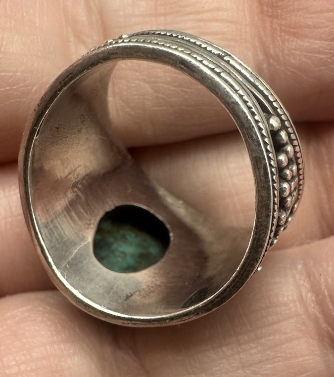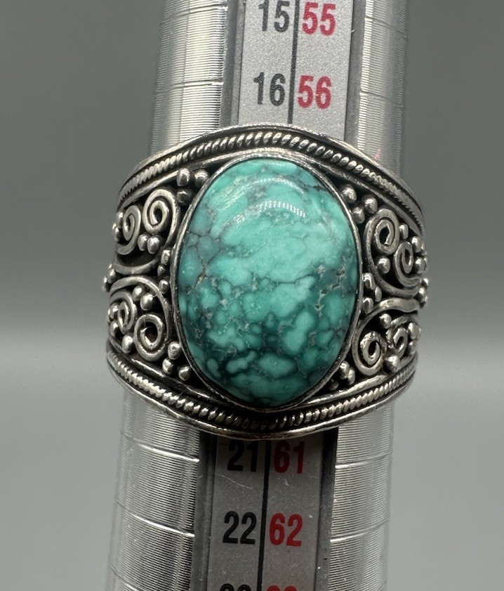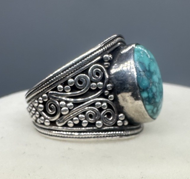 Turquoise 925 Sterling Filigree Ring Size 8.75 Ornate Bold Boho Swirl Teal Green