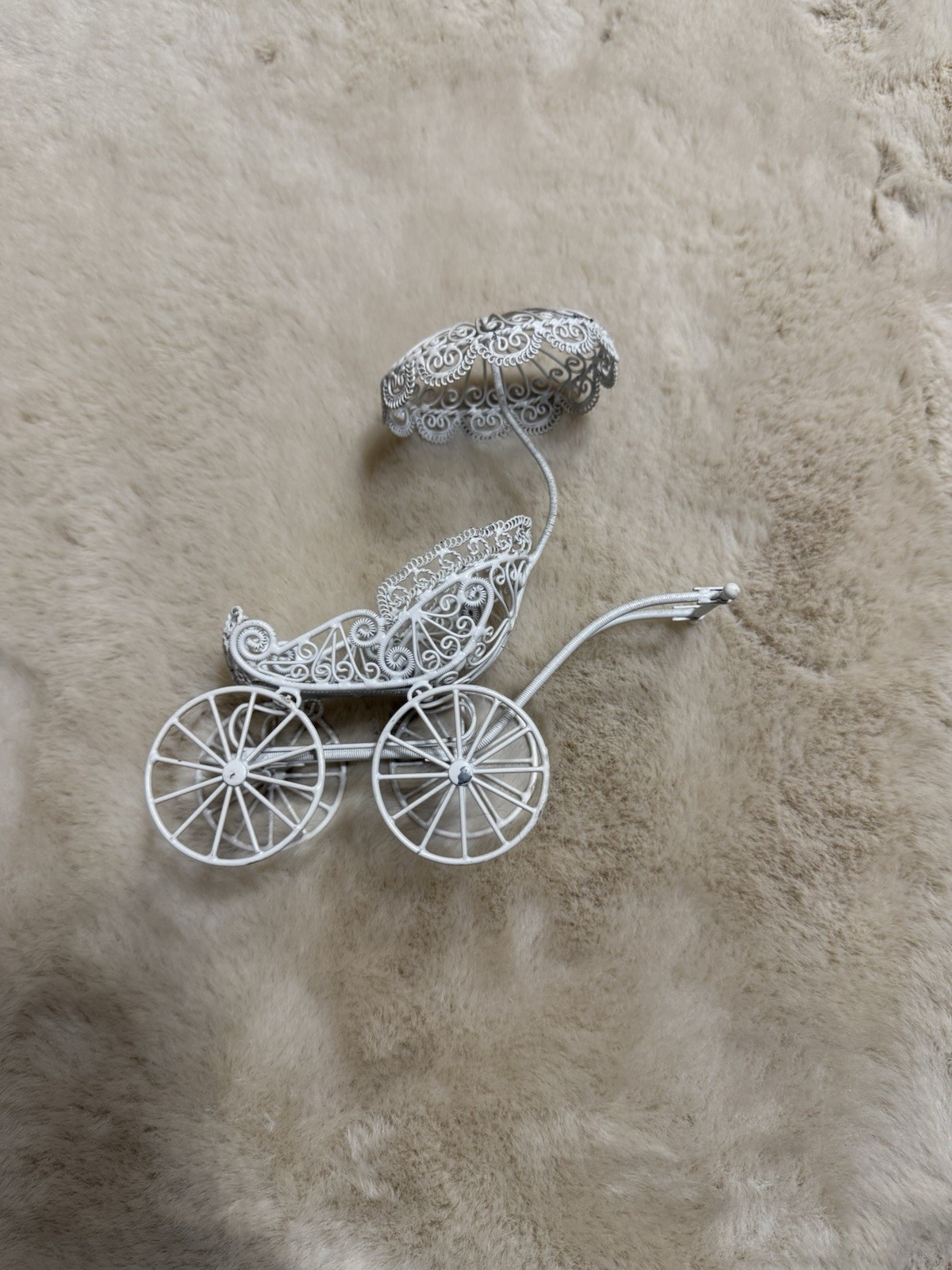 Vintage Ornate White Metal Baby Carriage with Canopy and Cushion Collectible