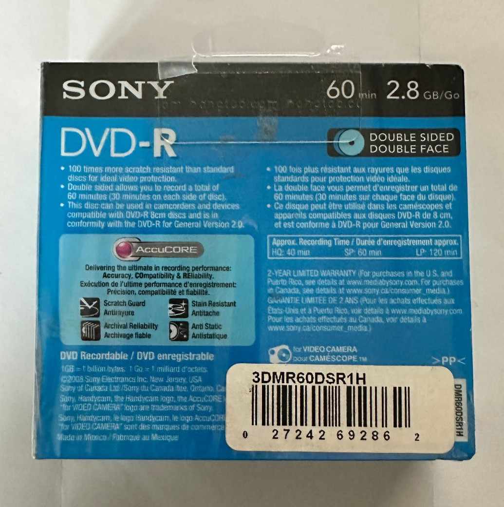 Sony Handycam Mini DVD-R Sealed 3 Pack 60min 2.8GB Double Sided Double Face Disc