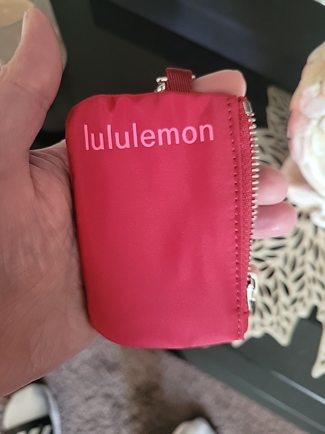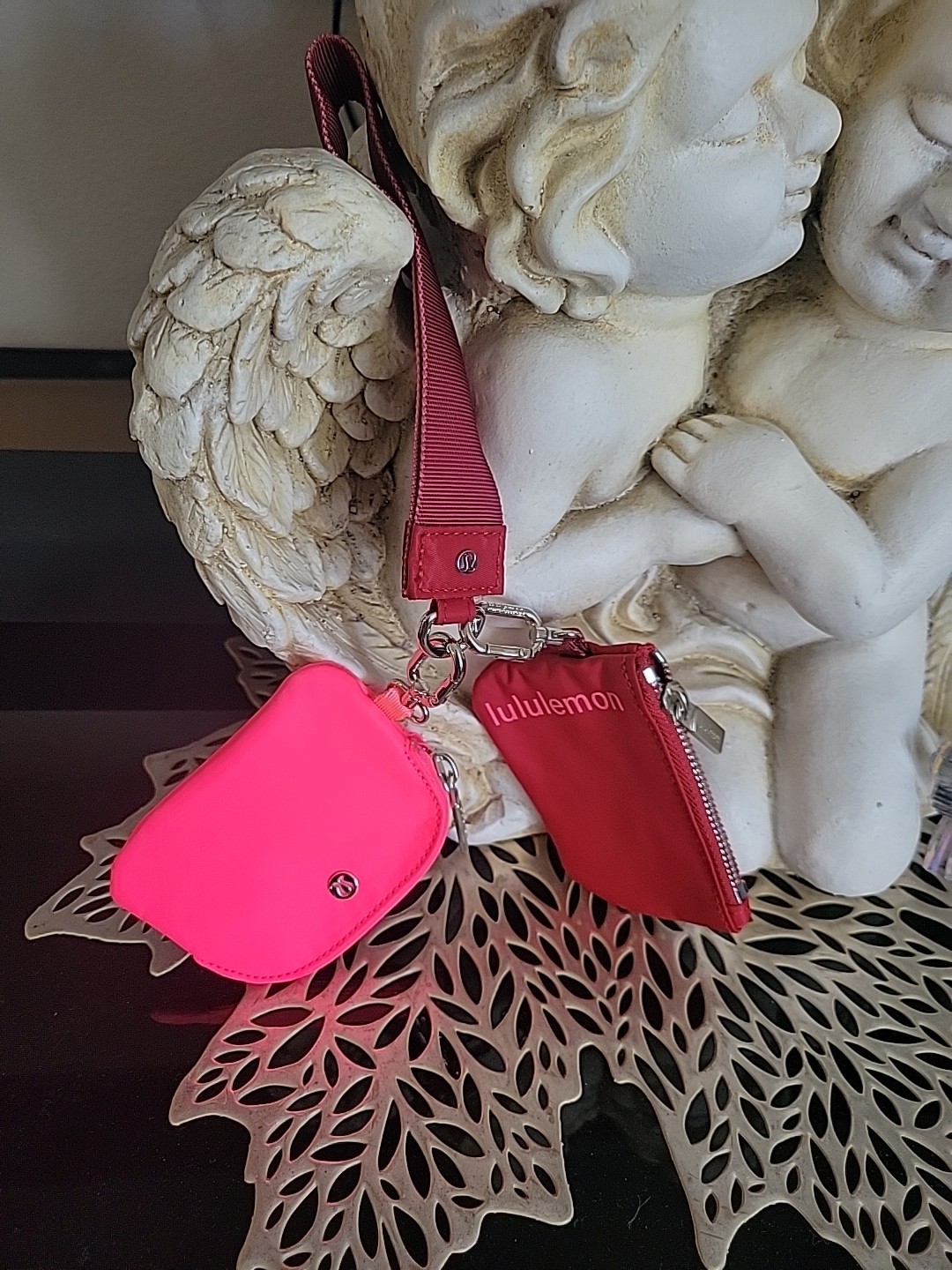 как выглядит LULULEMON Women s BURGUNDY and WHITE 2 Dual Pouchs With SILVER Wristlets фото