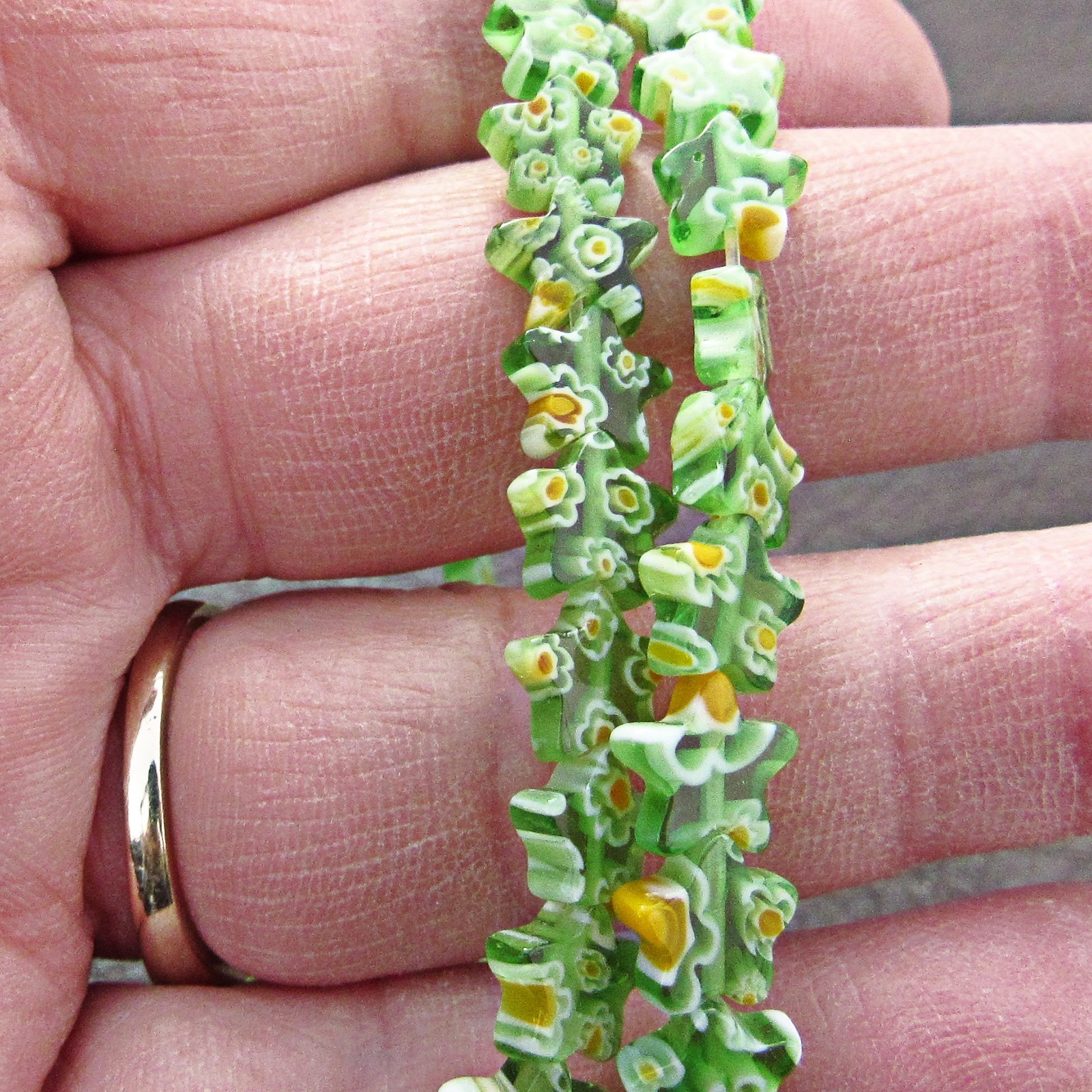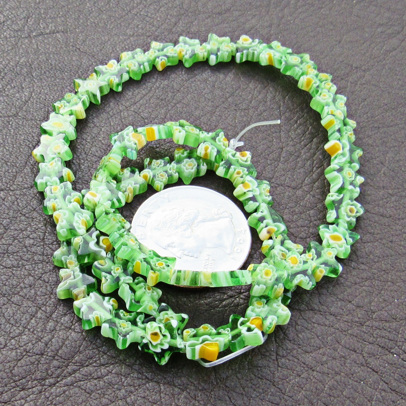 8mm Small Green Stars Millefiori Glass Beads, Full Strand, Yellow White