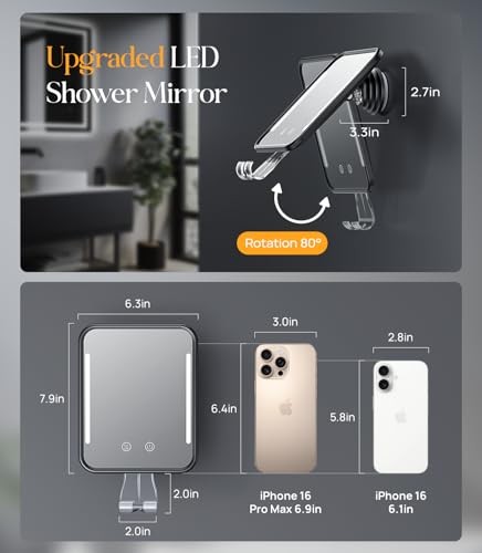 Heated Shower Mirror Fogless for Shaving with Light, Rechargeable Black