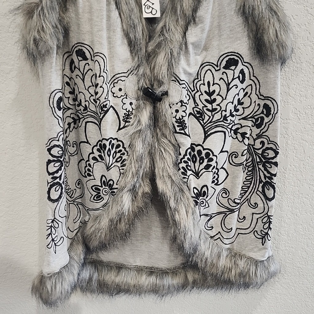 NWT RXB Gray Embroidered Vest with Faux Fur Trim Boho Y2K Vintage Inspired Large