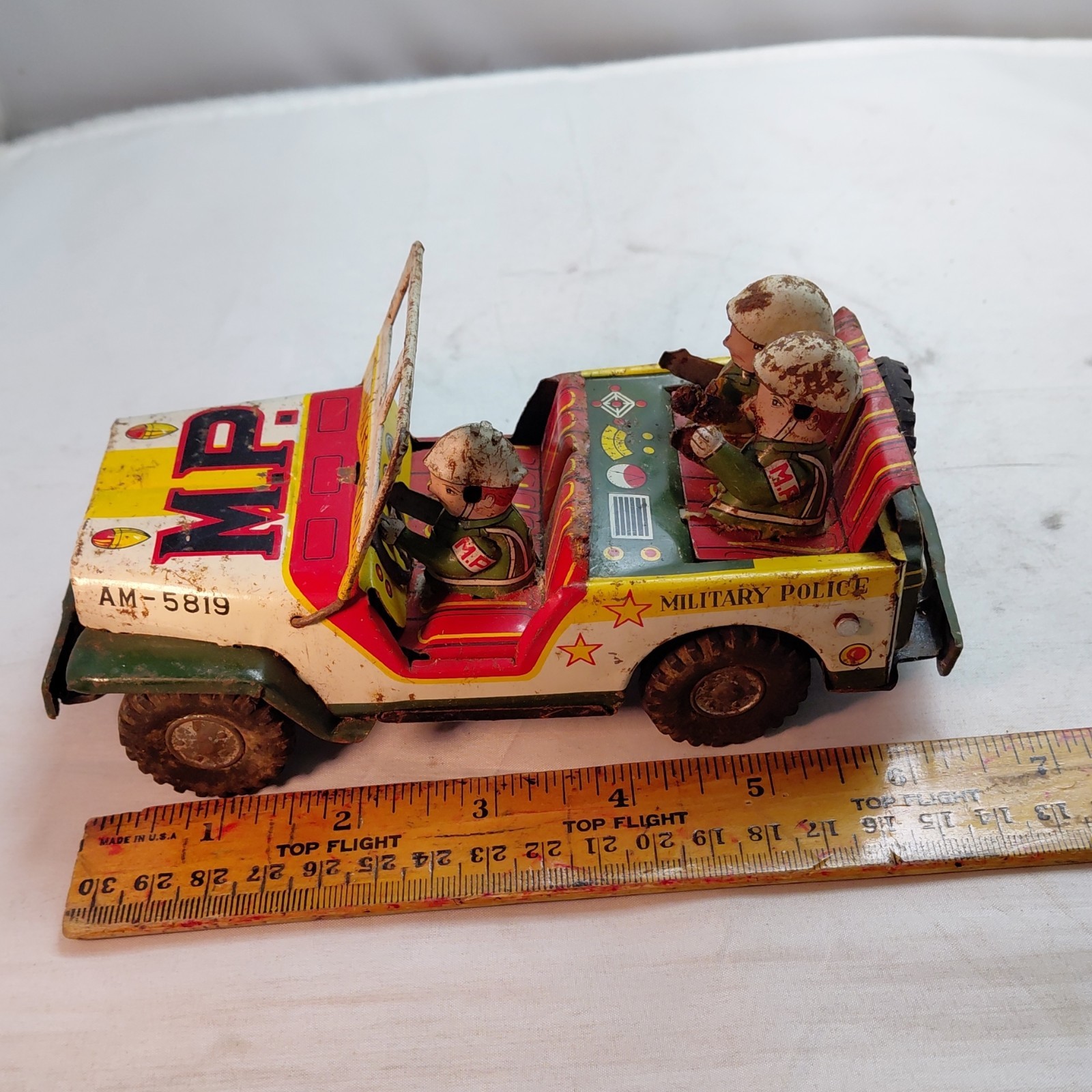 Vintage M.P. Military Police Tin Litho Jeep AM-5819 working Friction Car Japan