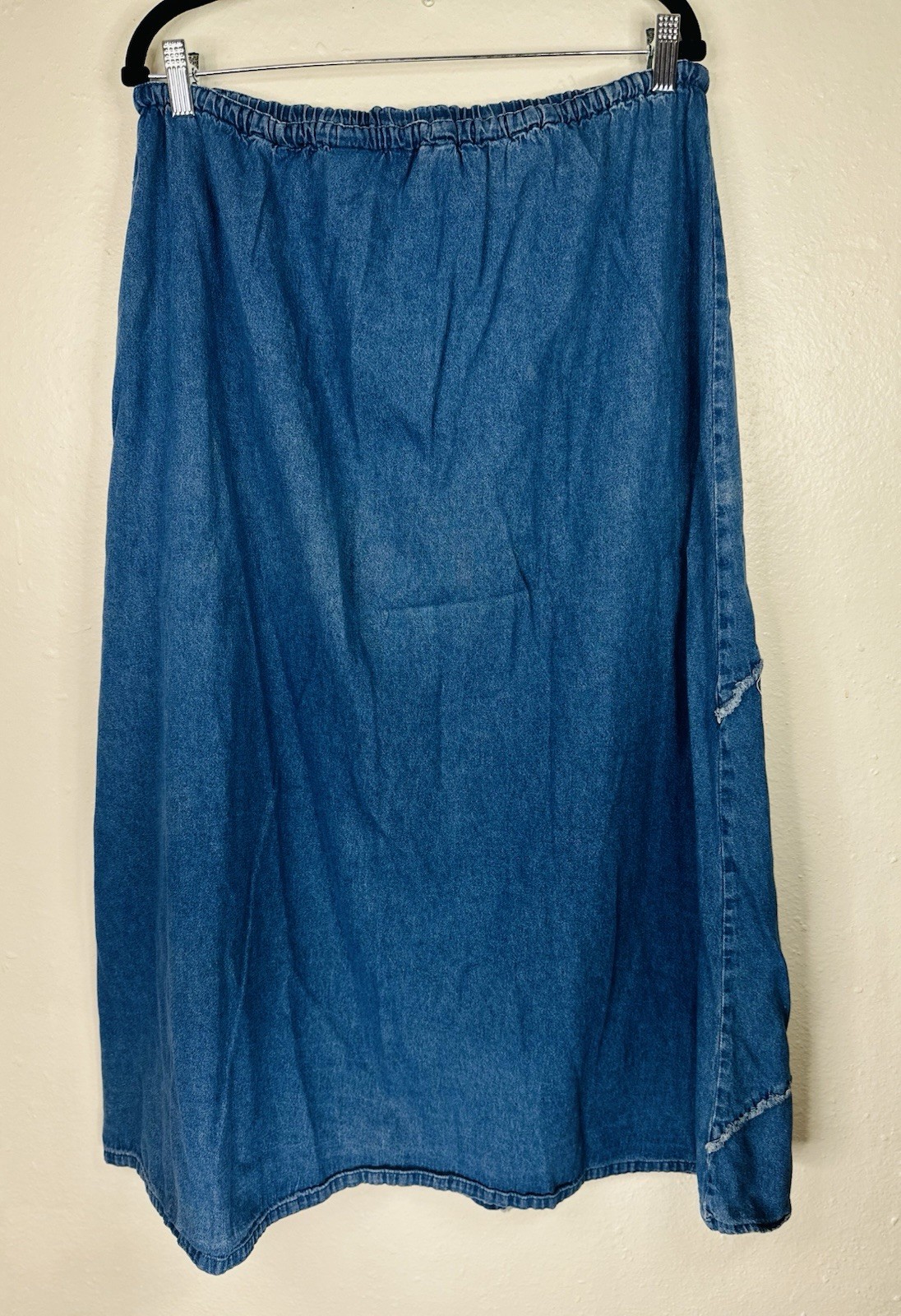 Vintage Denim Skirt Frayed Embroidered Flowers Large Maxi Y2K Cottage
