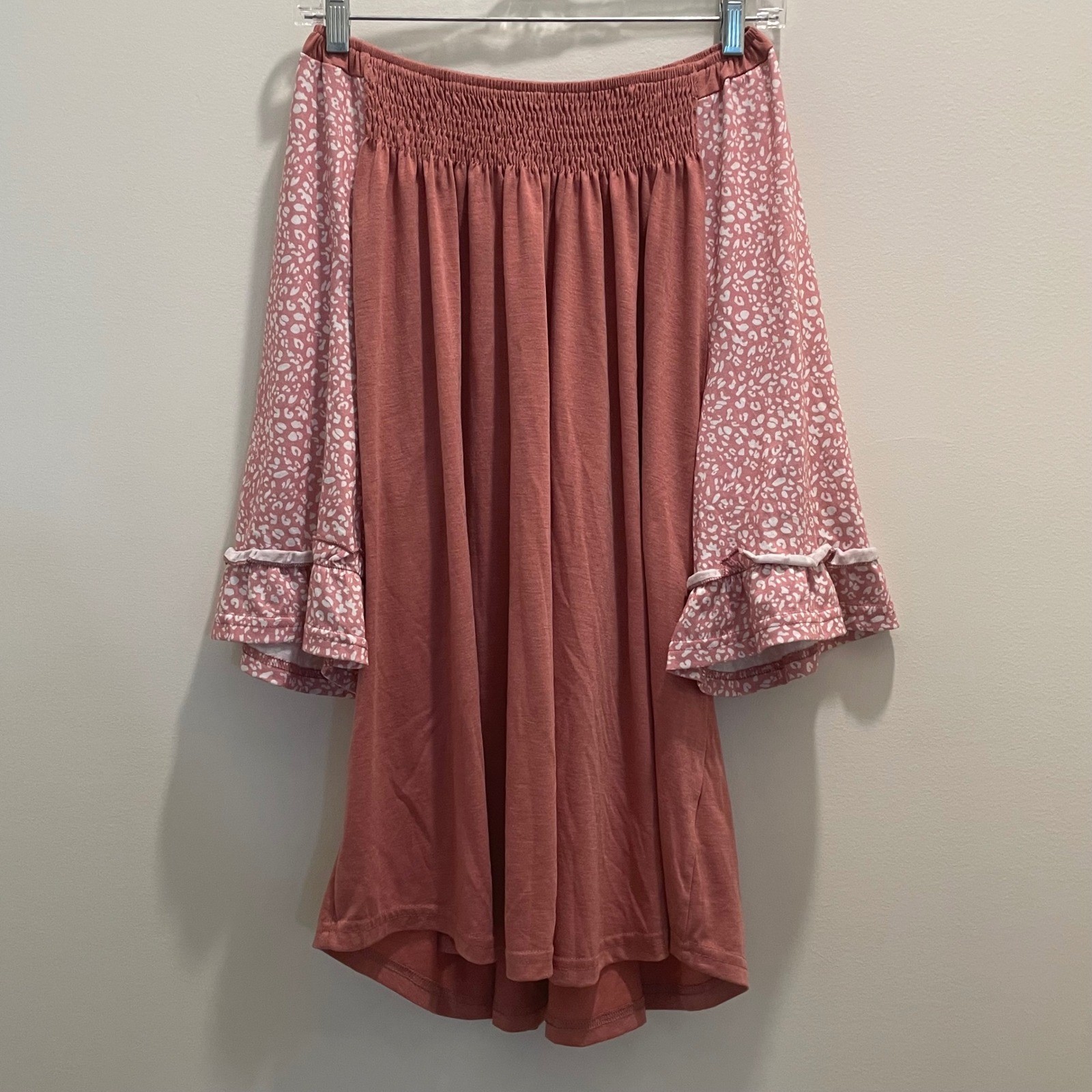как выглядит Pink Smocked Tunic Top 2XL Animal Print Ruffle 3/4 Raglan Sleeve Boho Blouse фото