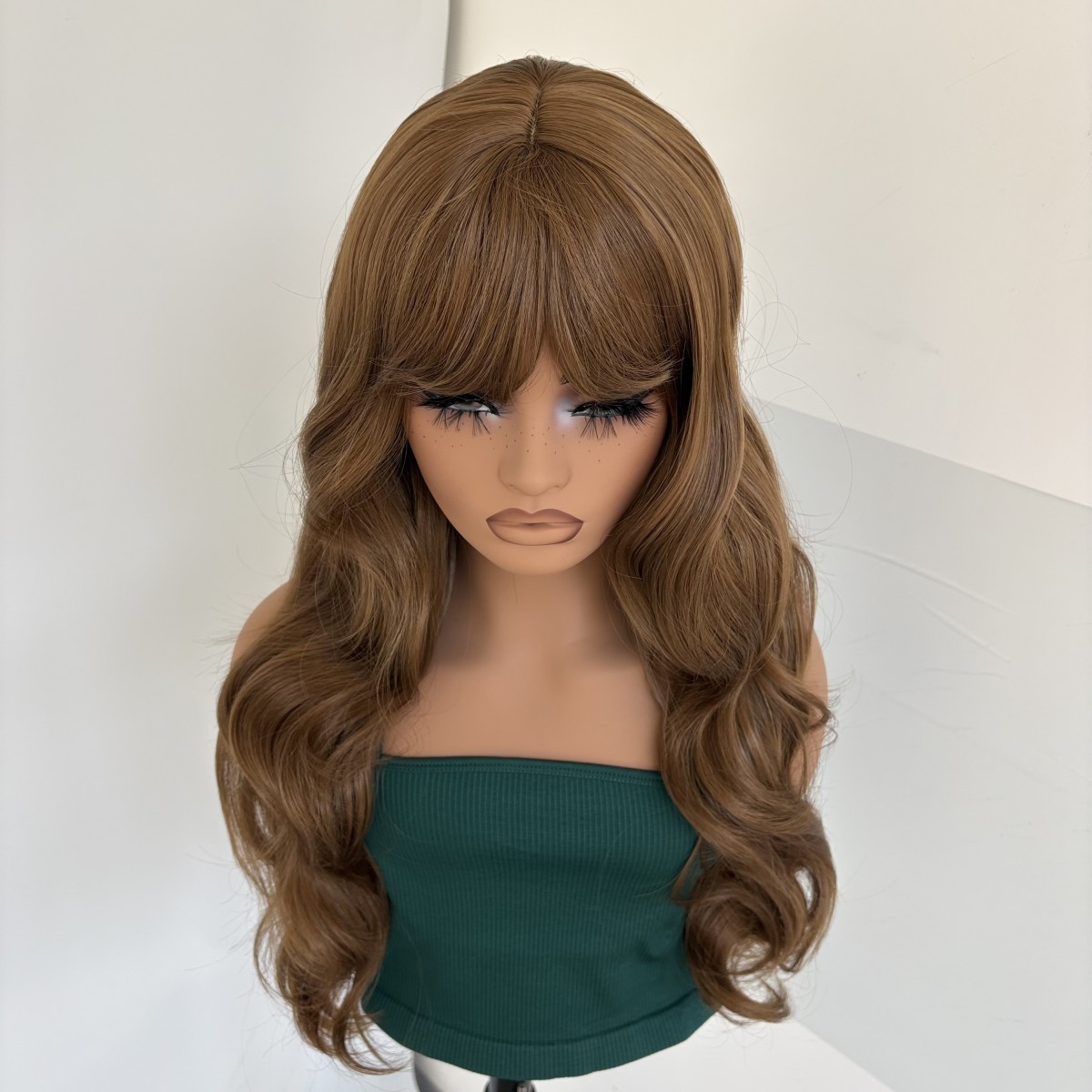 как выглядит Medium brown Layered Cosplay Party Wig With Bangs Synthetic Hair Long Wavy фото
